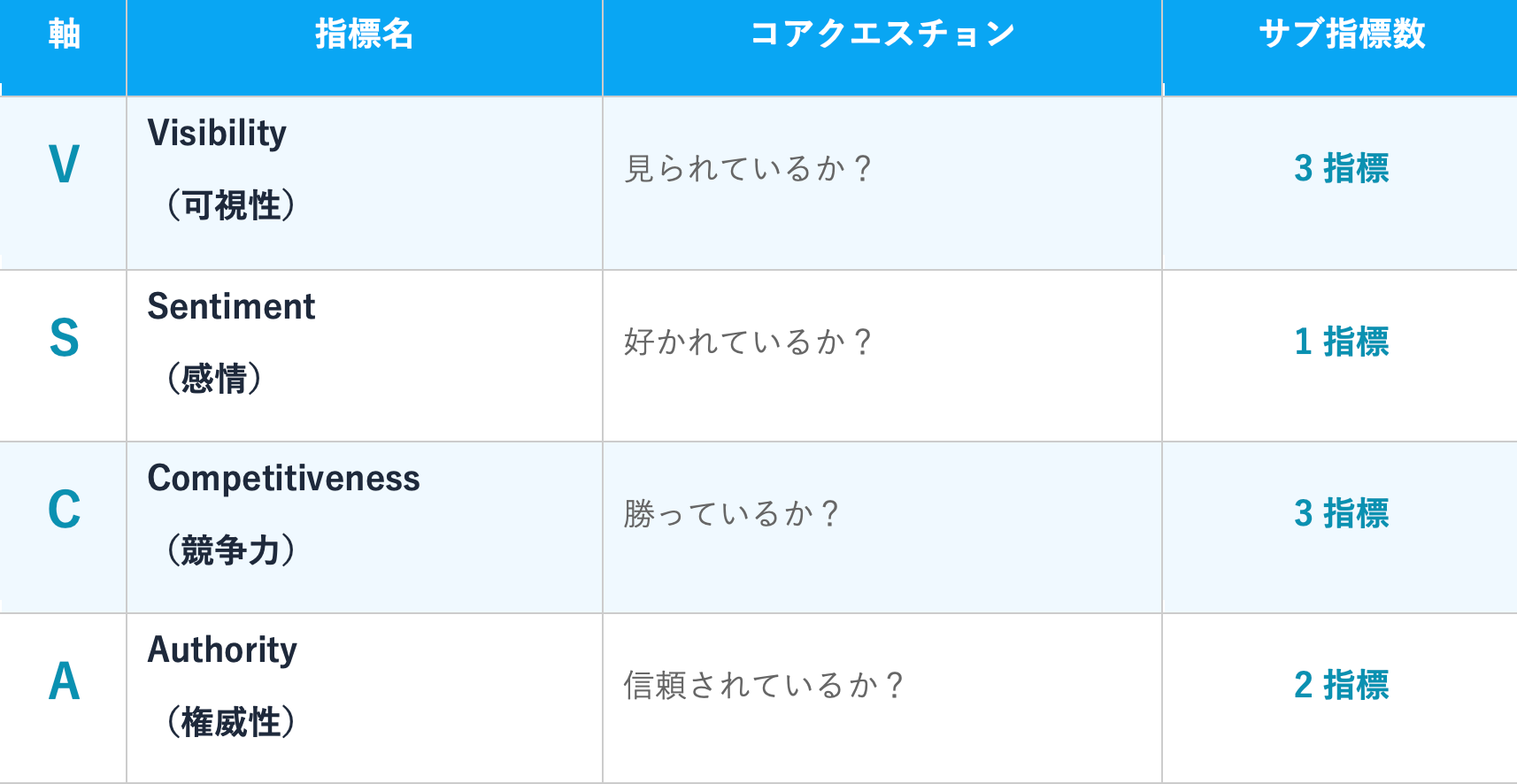 VSCA™ Scoreは、AI検索エンジンがブランドをどのように認識・評価・表示しているかを、以下の4つの軸で総合的にスコア化した独自の評価指標です。