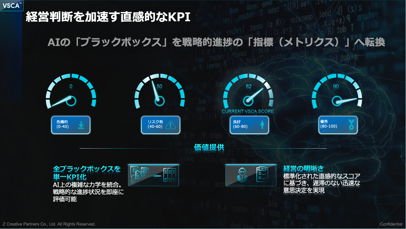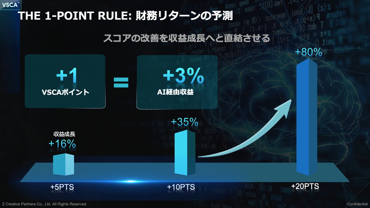 1. 本プレスリリースに記載のVSCA™ Scoreの算出方法および統合収益モデルに含まれるビジネスインパクトの数値は、株式会社Z Creative Partnersが独自に開発・分析したものであり、引用する第三者調査データは各出典元の公表情報に基づいています。記載の効果・数値は特定の成果を保証するものではなく、実際の結果は業種・市場環境・競合状況等により異なります。