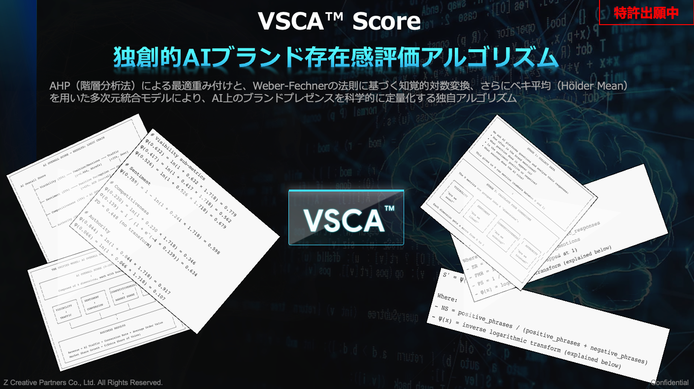 Z Creative Partnersは、この課題に対し、AI検索におけるブランドプレゼンスを単一の総合スコアで評価できるフレームワーク「VSCA™ Score」を開発しました。