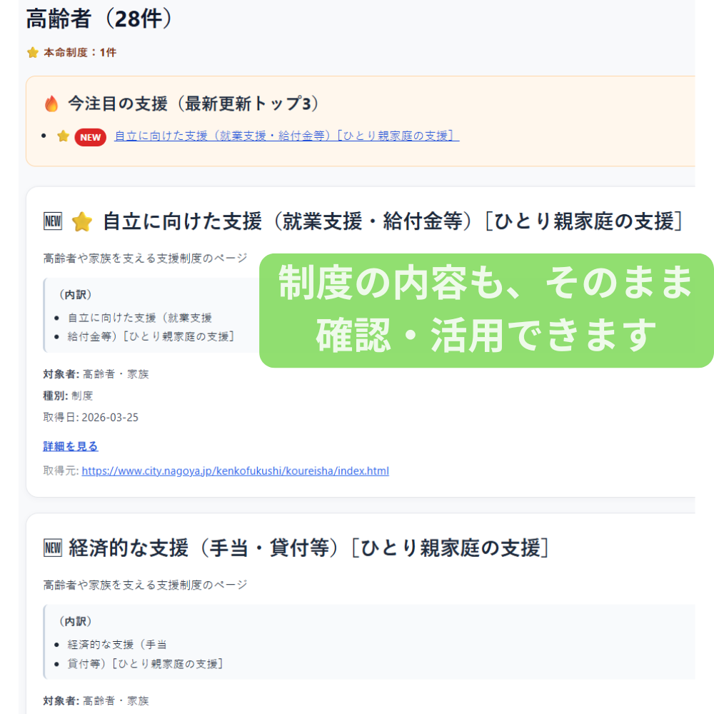 この課題を解決するために、名古屋市の支援制度を毎日自動で整理する