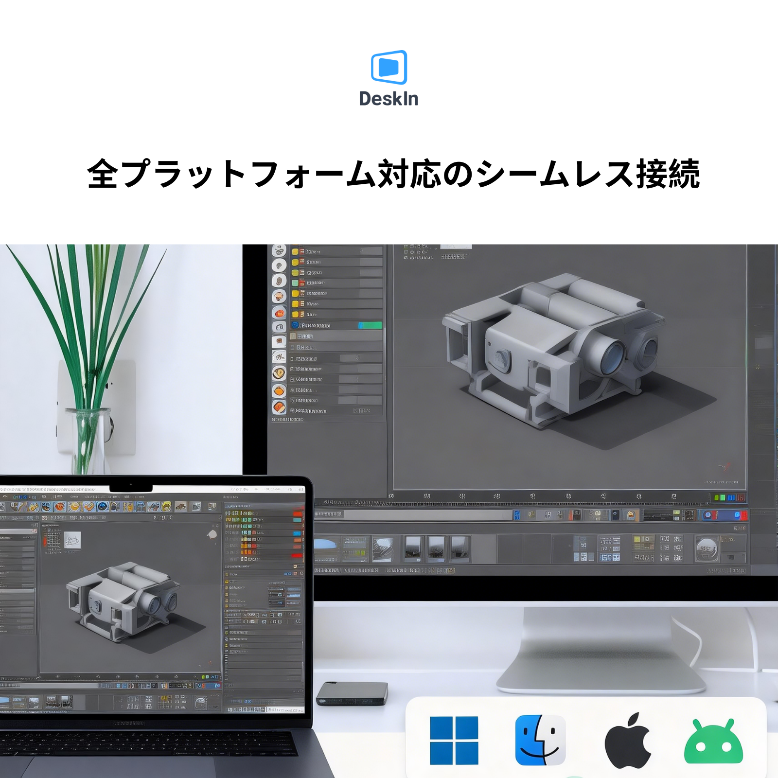 平面デザインや画像処理、3Dモデリング、4K映像制作、アニメーションレンダリングまで、DeskInはあらゆるデバイスデバイスをつなぎ、クリエイターのワークフローを途切れなく支援します。