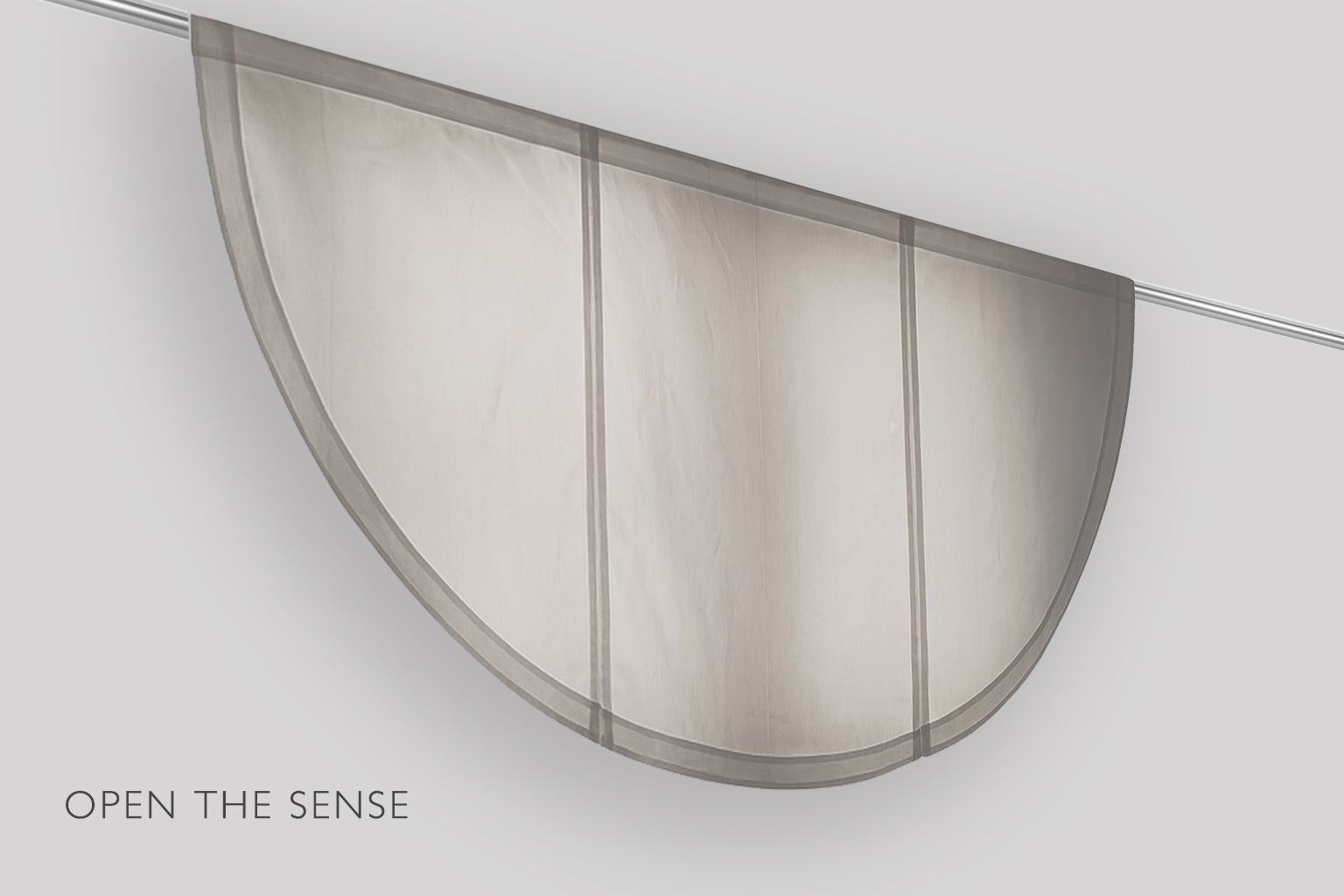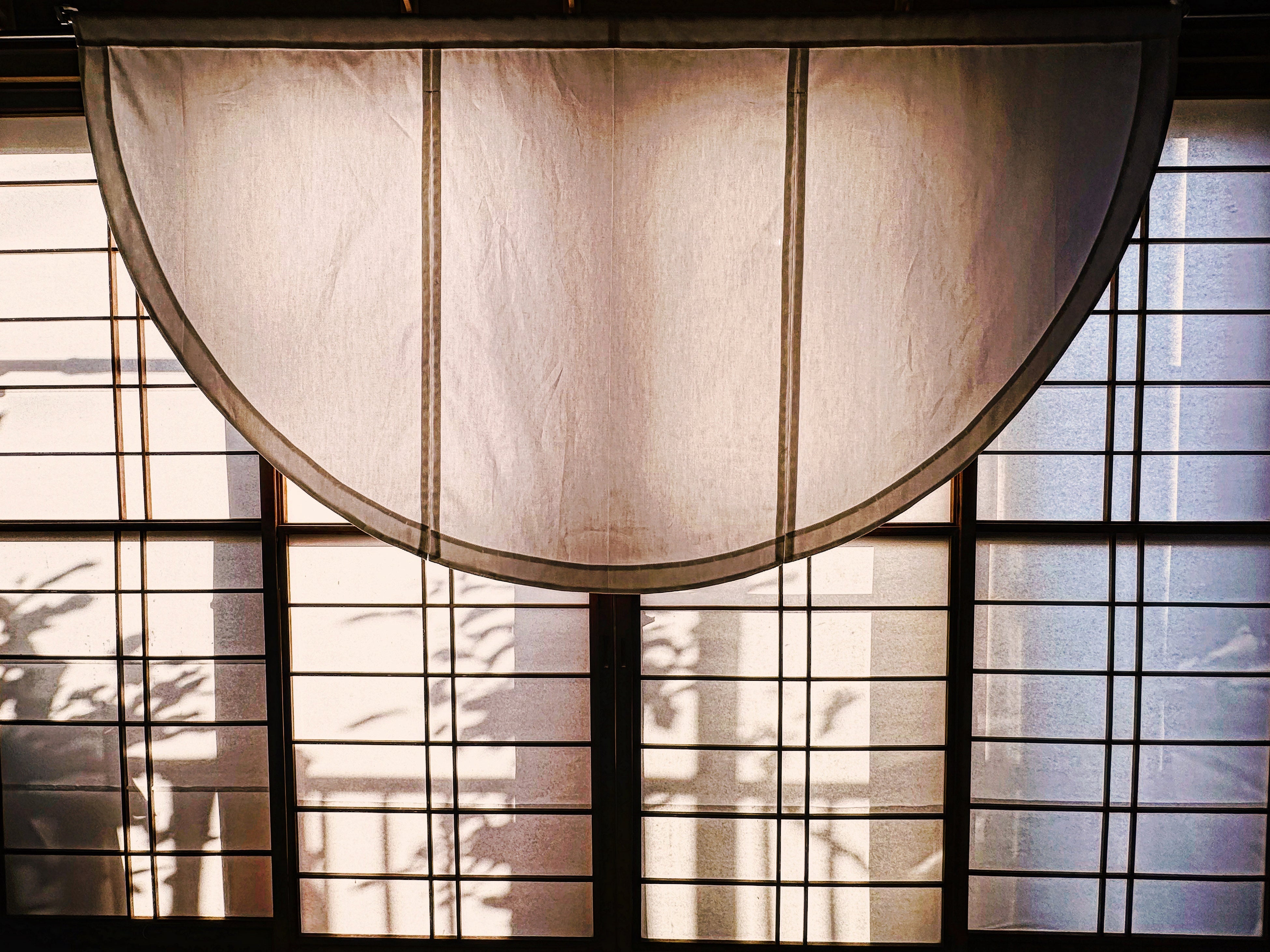 従来の四角い暖簾とは異なり、半円形の曲線を持つ独自形状は、空間にやわらかな余白と動きを生み出
