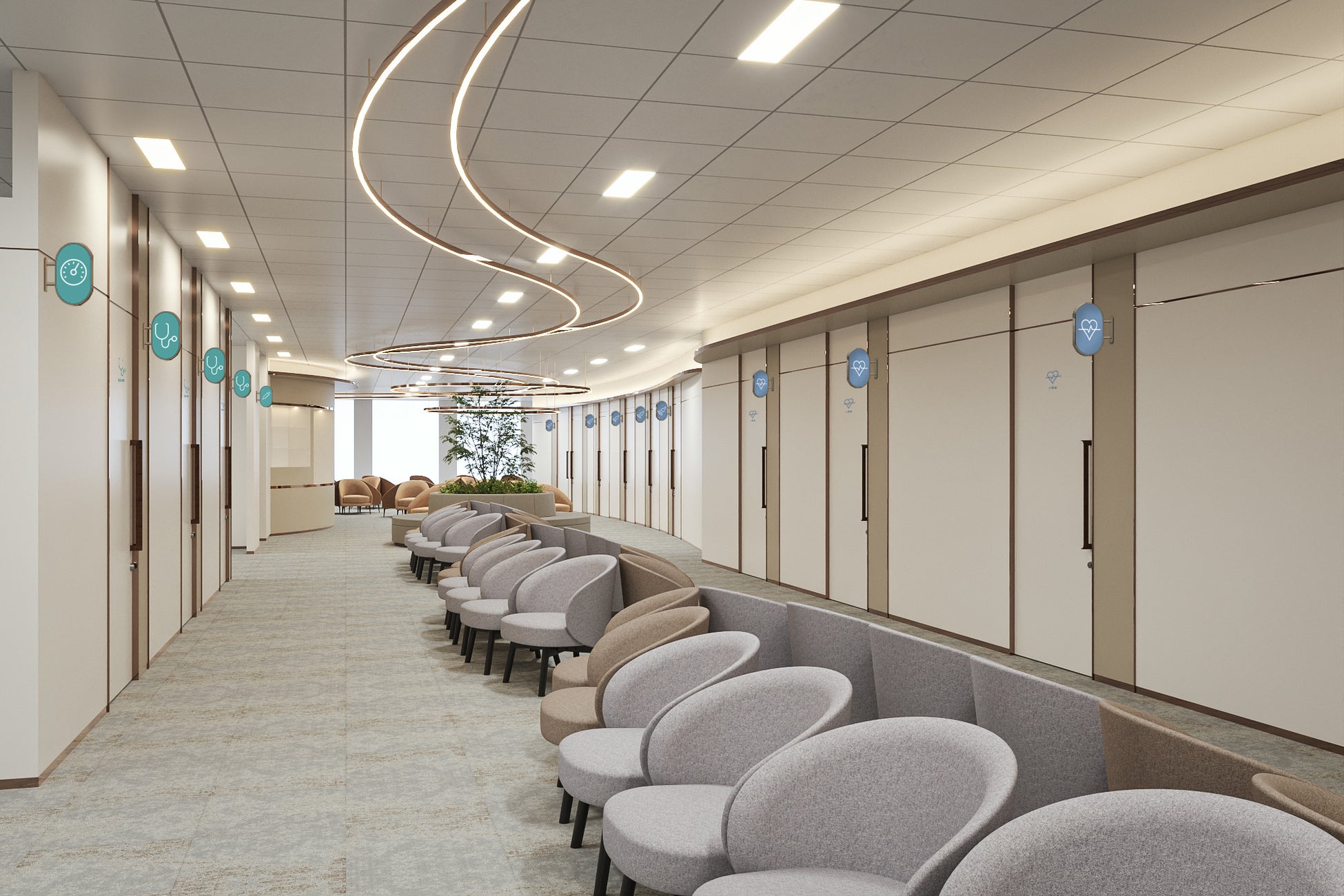 最初に受診者様を迎える「ホスピタルロビー」は、従来の医療施設にありがちな緊張感や堅苦しさを感じさせない、開かれた空間として整備されています。明るく落ち着いた雰囲気の中でスタッフに相談しやすい環境を整えることで、初めて訪れる方でも自然と安心感を抱けるよう配慮されています。ここは新しい健康習慣の入口としての重要な役割を果たします。