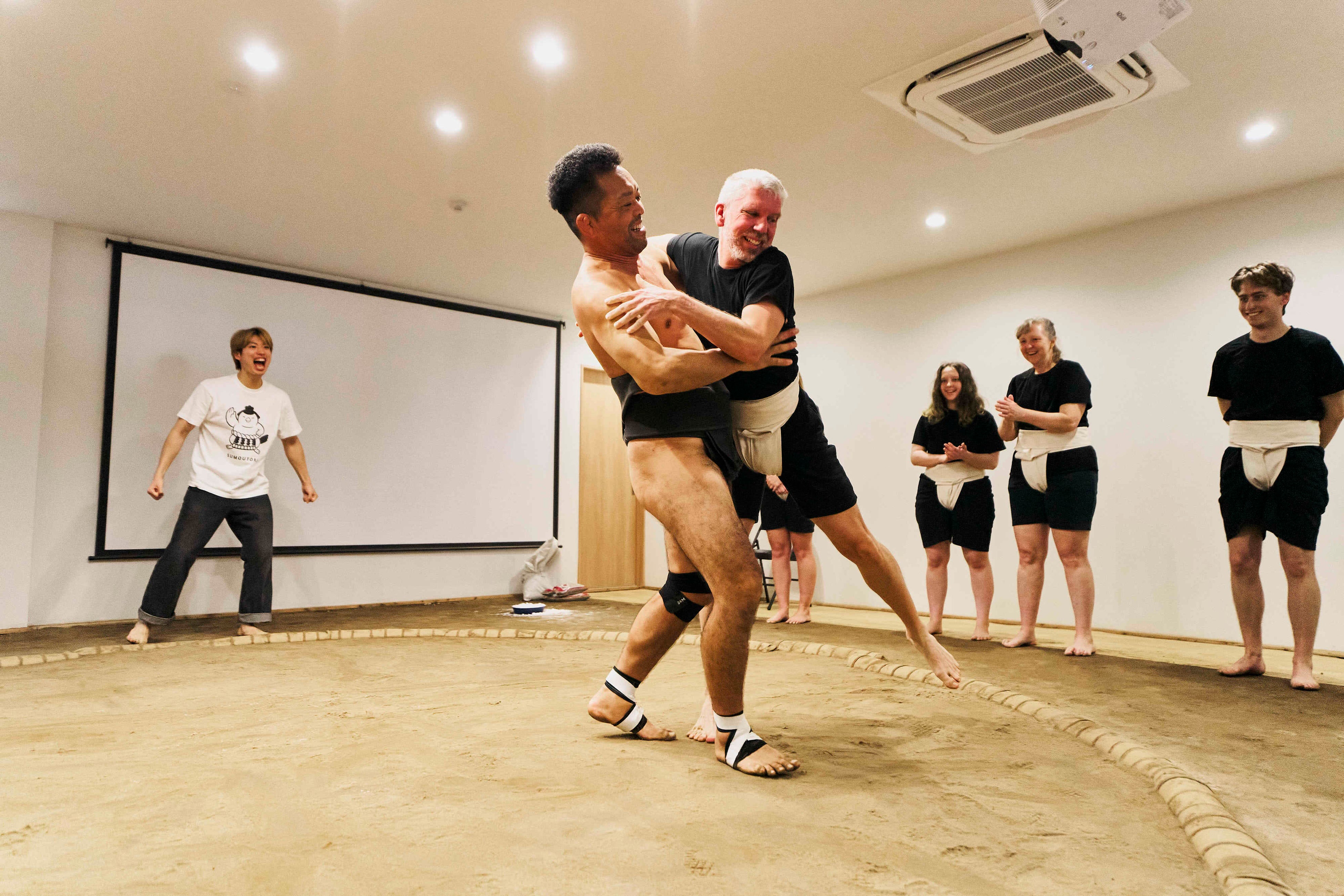 スタジオは最大50名様までの同時入場が可能です。 インバウンドの団体ツアーや教育旅行など、大型バス1台規模のグループをバラけさせることなく、全員同時に本格的な相撲体験が可能です。
