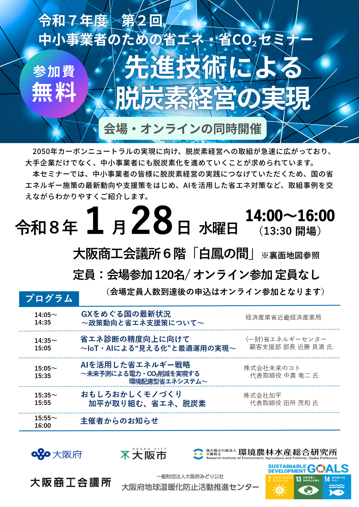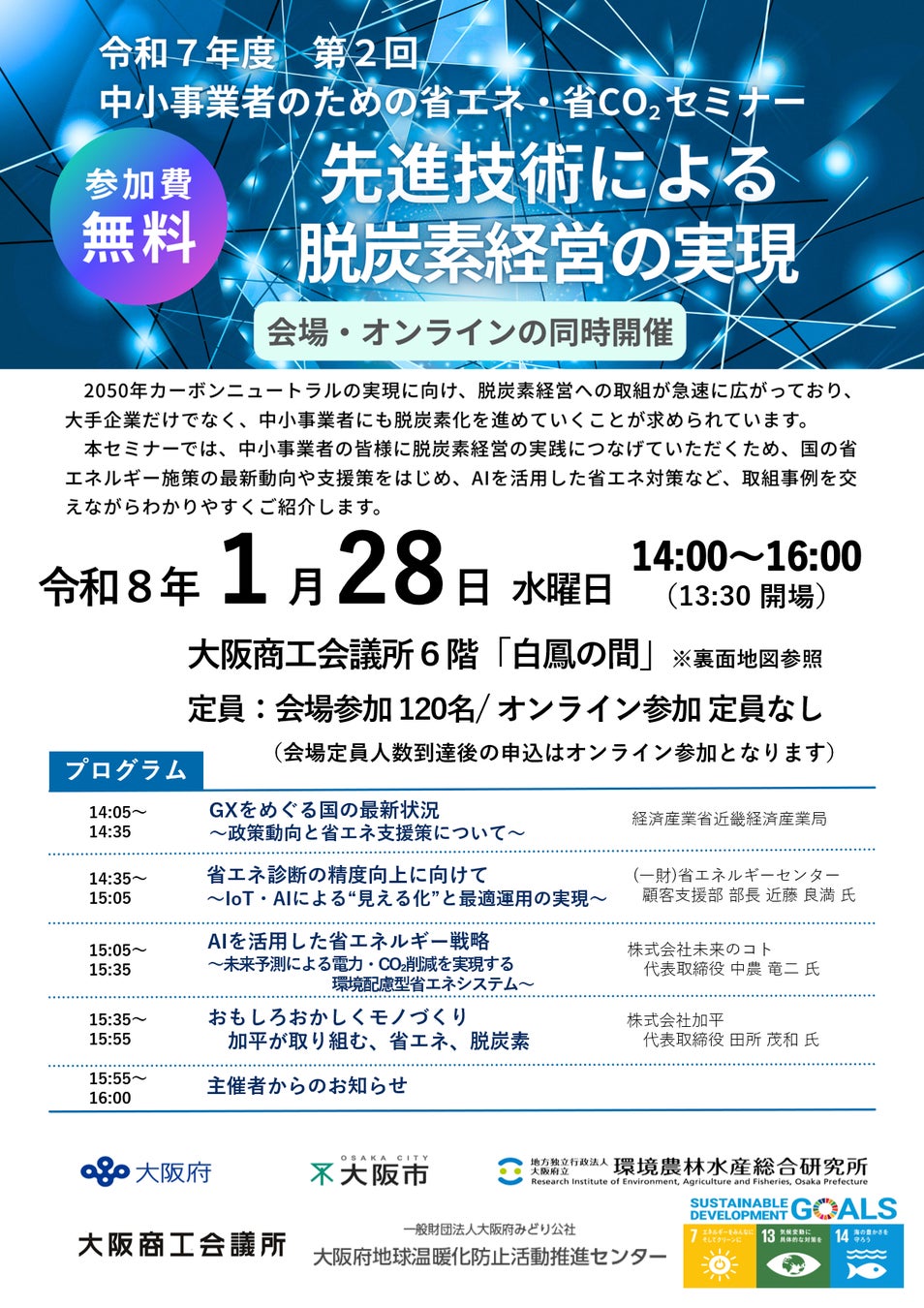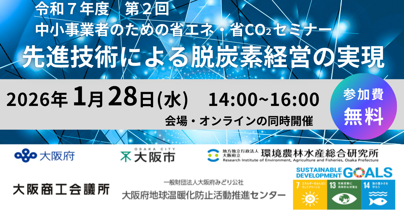 一般財団法人大阪府みどり公社(本部:大阪府大阪市、代表:南部 和人)内に拠点をおく「大阪府地球温暖化防止活動推進センター」は、2026年1月28日(水)に、大阪商工会議所およびオンラインにて「中小事業者のための省エネ・省CO₂セミナー」を、おおさかスマートエネルギーセンター、地方独立行政法人大阪府立環境農林水産総合研究所、大阪商工会議所と共同で開催いたします。