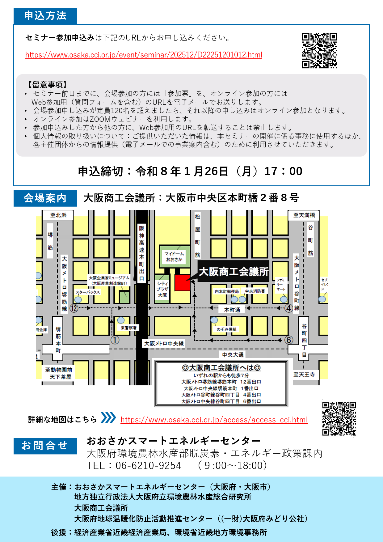 大阪府地球温暖化防止活動推進センター((一財)大阪府みどり公社) おおさかスマートエネルギーセンター(大阪府・大阪市) 地方独立行政法人大阪府立環境農林水産総合研究所 大阪商工会議所 |