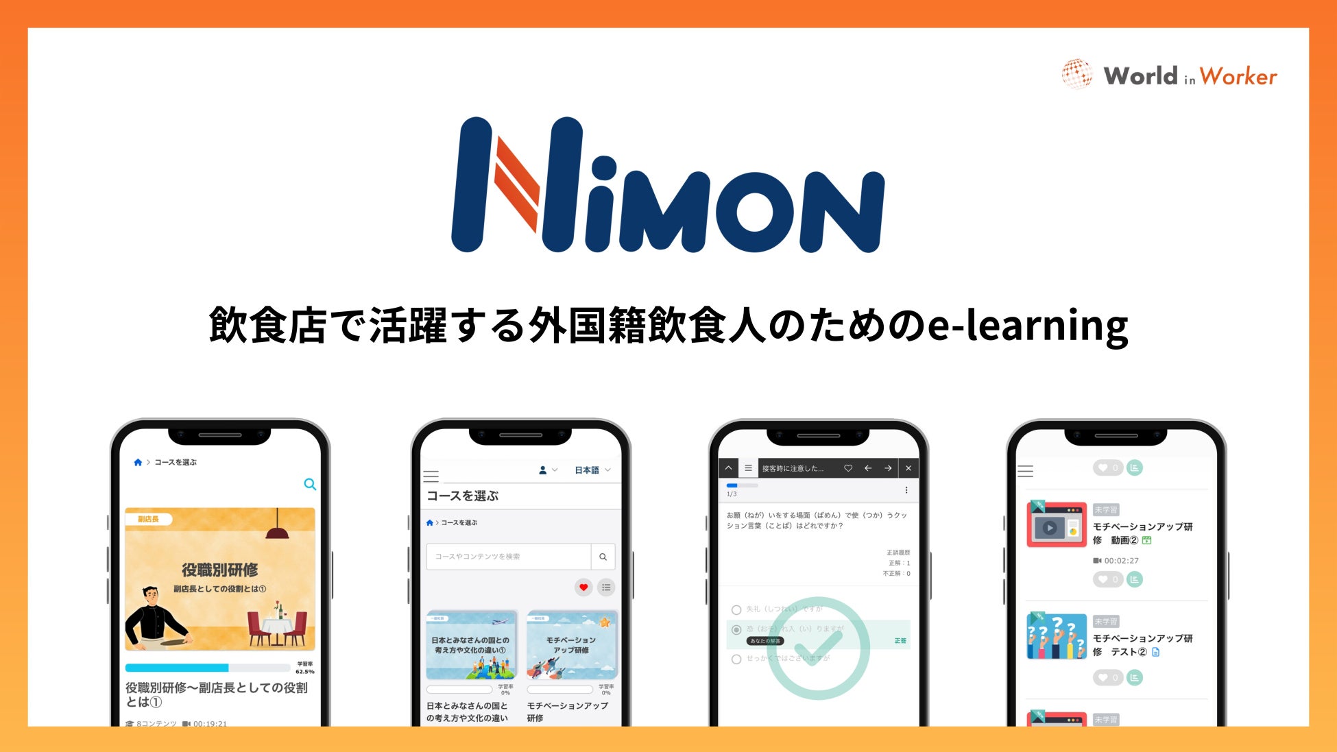 クックビズ株式会社のグループ会社で、特定技能外国人の登録支援機関である、ワールドインワーカー株式会社(本社:東京都中央区、代表取締役社長:藪ノ 賢次、以下ワールドインワーカー)は、登録支援サービスの一環として、飲食店で働く外国籍人材向けe-learningサービス「NIMON(ニモン)」をリリースしました。