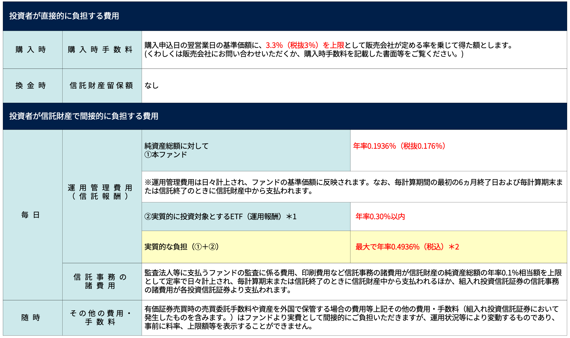 *2 この数値は最大値であり、実質的に投資対象とするETFの投資状況等により変動します。実際の組入比率は運用状況に応じて変動するため、受益者が実質的に負担する率も変動します。通常の状況下においては、上記を下回ることを想定しています。