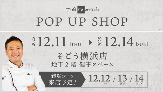 洋菓子店「トシ・ヨロイヅカ」(東京・神奈川4店舗運営、オーナーシェフ鎧塚俊彦)は、2025年12月11日(木)~12月14日(日)そごう横浜店(神奈川県横浜市)にてPOP UP SHOPを開催します。