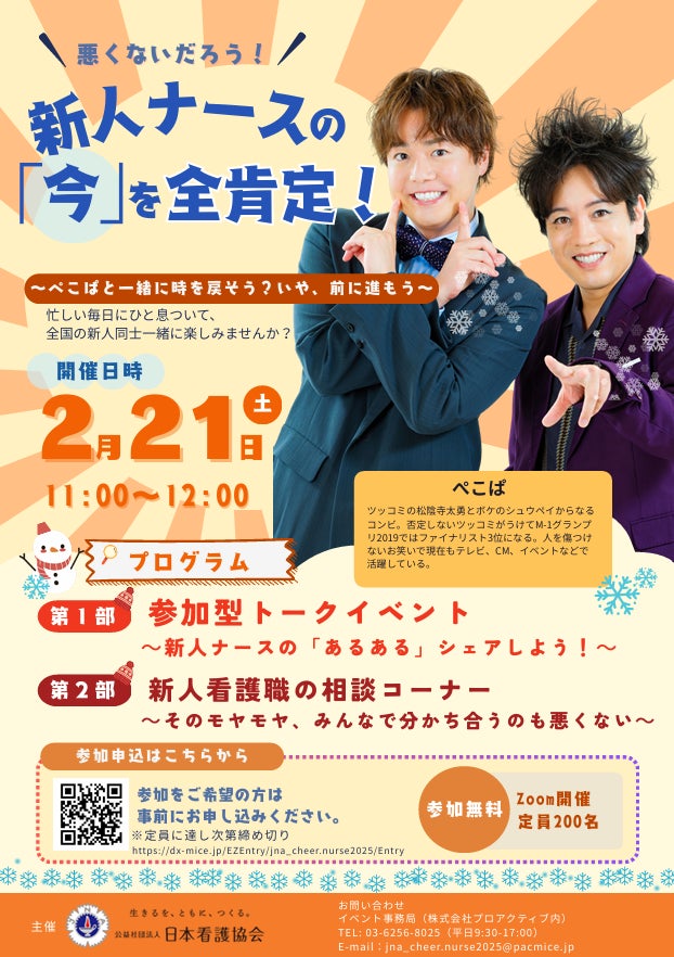 公益社団法人日本看護協会(会長:秋山智弥、会員73万人)は、厚生労働省の補助金事業として運営する「看護職応援サイト」( https://cheer.nurse.or.jp/ )の企画として、新人ナースを対象とした無料オンラインイベント「新人ナースの『今』を全肯定!~ぺこぱと一緒に時を戻そう?いや、前に進もう~」を開催します。