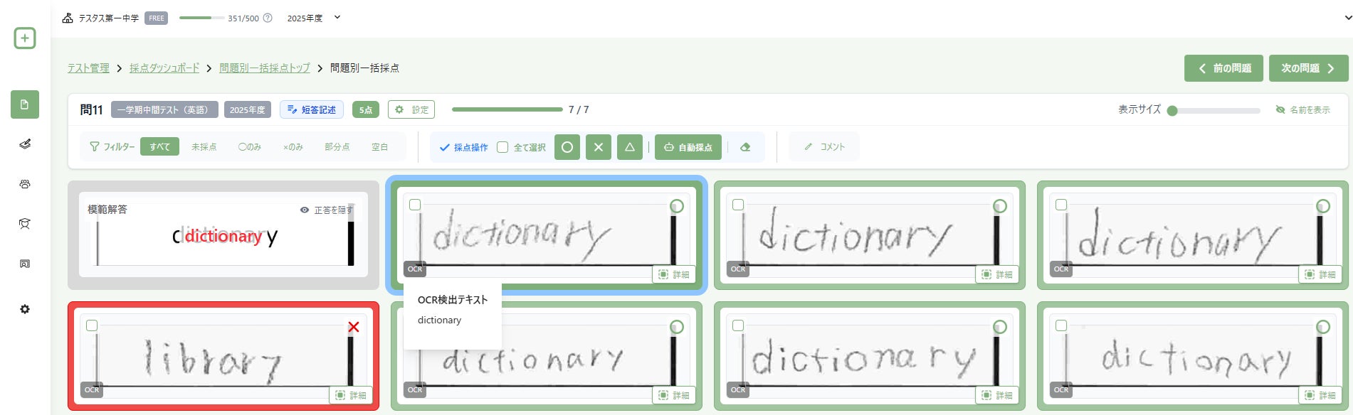高精度なAI採点: 独自の生成AIモデルにより、記号問題だけでなく、従来のOCRでは困難だった縦書きや英数字、記述式・長文問題も高精度で認識・自動採点します。
