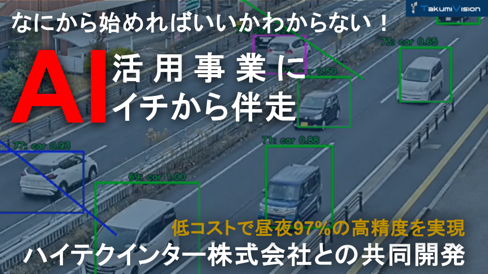 TakumiVision株式会社(本社:京都府京都市、代表取締役:片桐 一樹)は、産業用ネットワーク機器のソリューション企業であるハイテクインター株式会社(本社:東京都渋谷区)と共同で、カメラ映像をAIで解析する交通量計測システムを開発しました。
