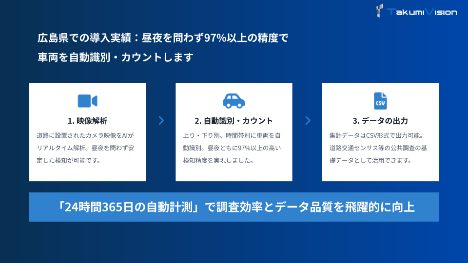広島県で導入されたAI交通量計測システムでは、カメラ映像をAIが解析し、車両を自動で識別・カウントする仕組みを構築しました。