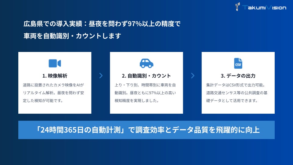 TakumiVisionでは今後、自治体やインフラ事業者と連携しながら、交通量調査や人流解析などのAI活用をさらに拡大し、都市交通データの高度化に貢献していきます。