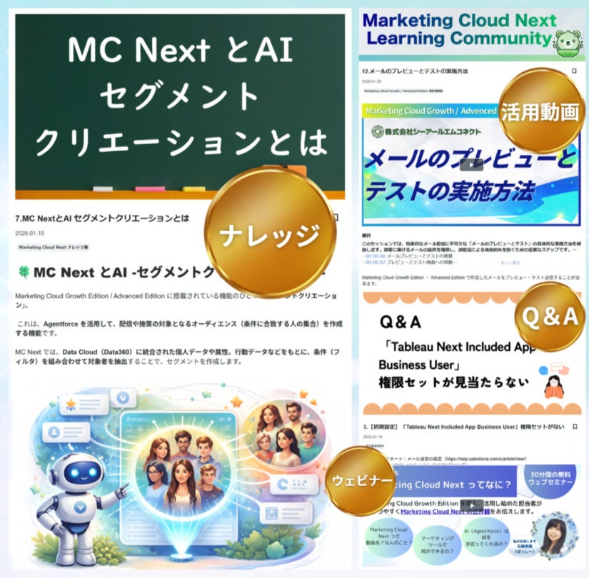 本サービスは、Marketing Cloud Next の活用に役立つコンテンツを体系的に提供することで、導入企業様・ご利用者様のスムーズなプロダクト活用を支援する学習コミュニティです。