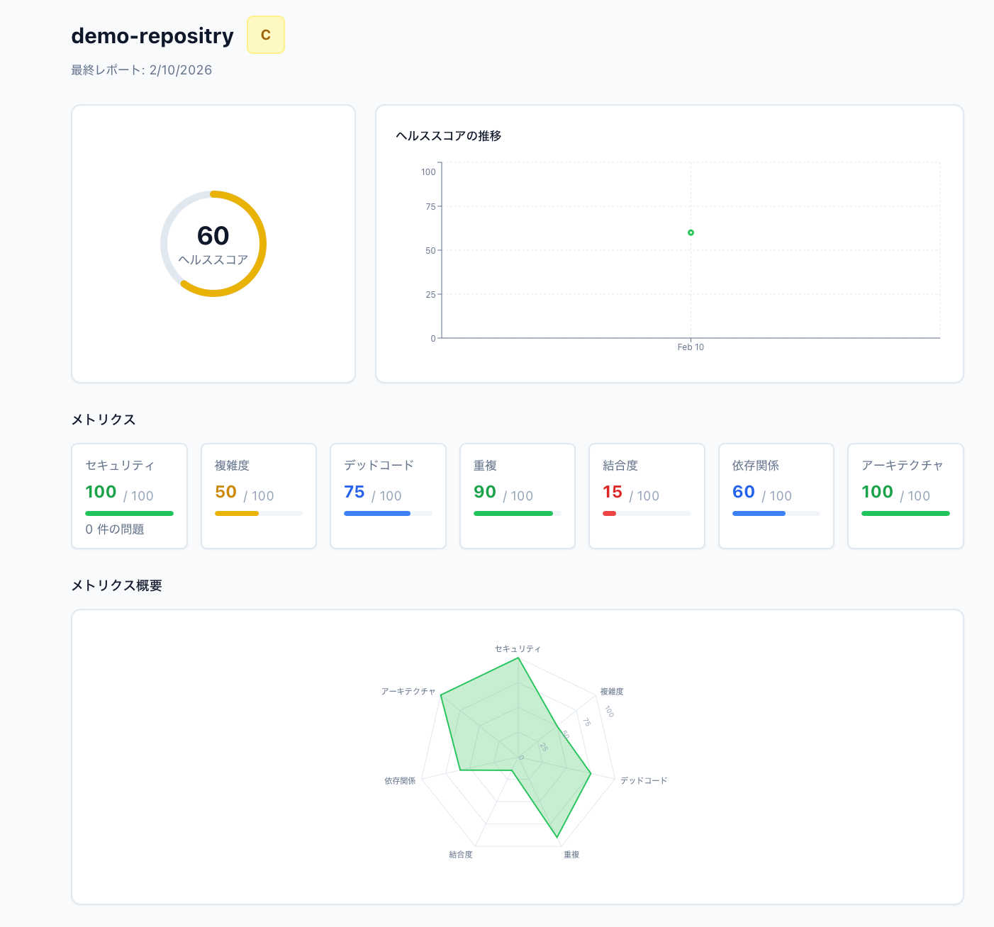 以下は、pyscnでサンプルリポジトリを分析した結果です。Health Scoreやメトリクス別スコアにより、コードベースの健全性が一目で把握できます。