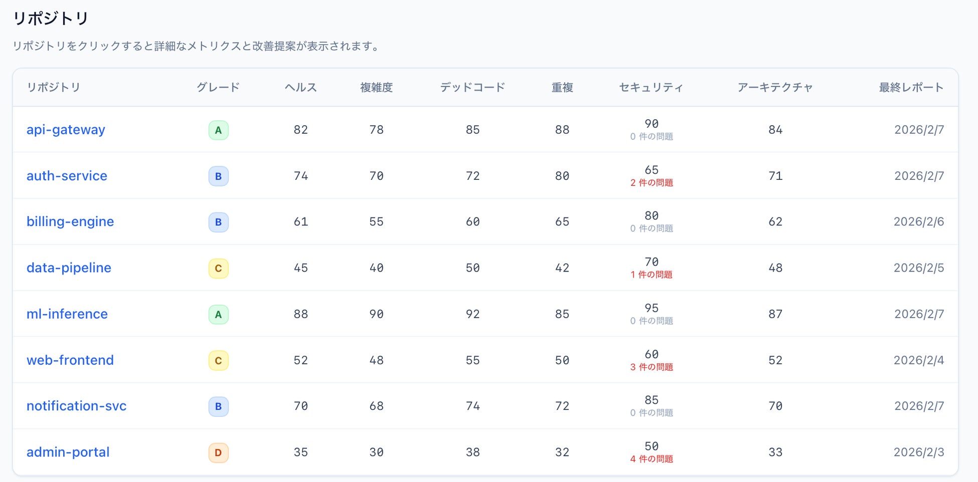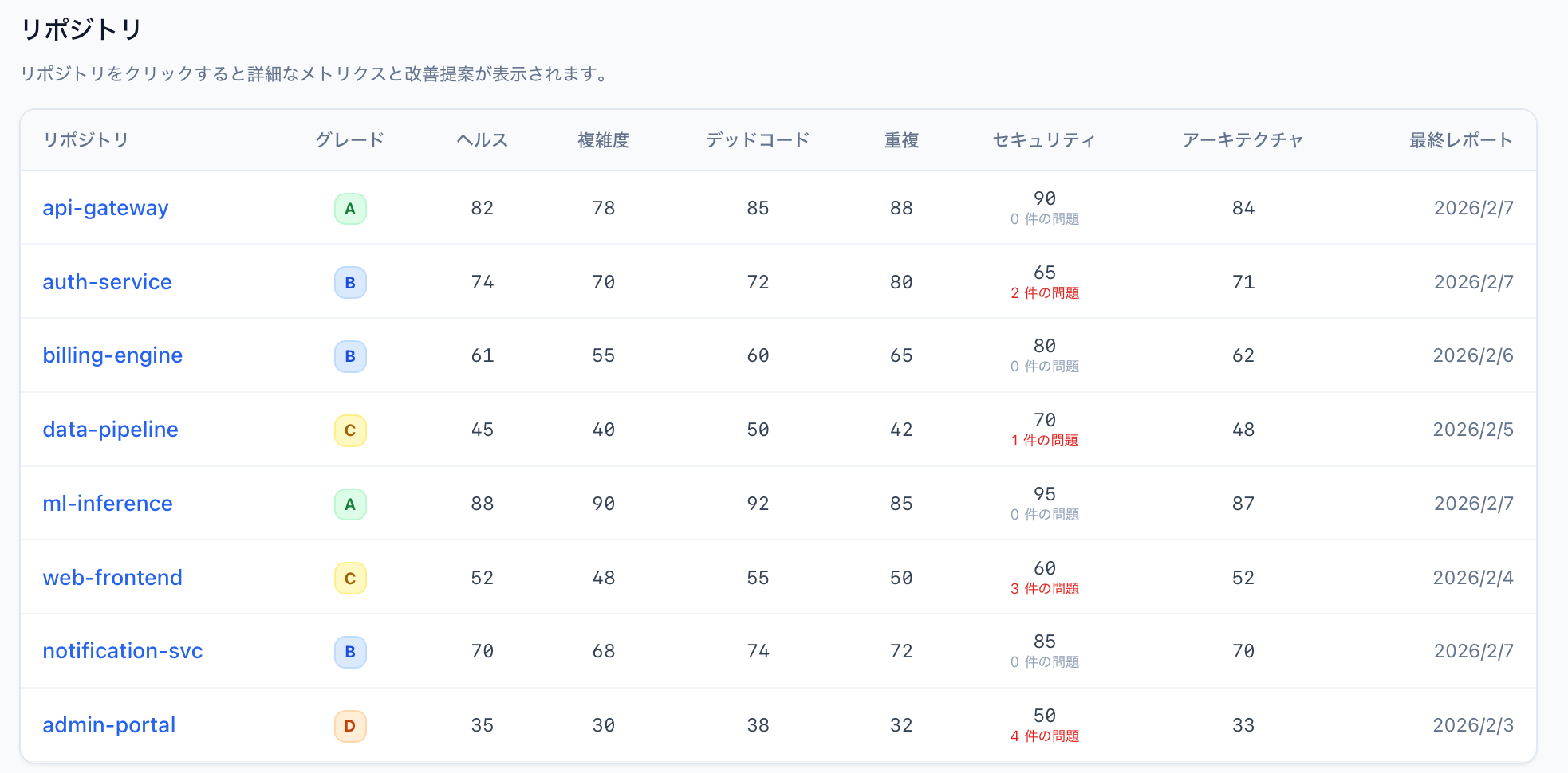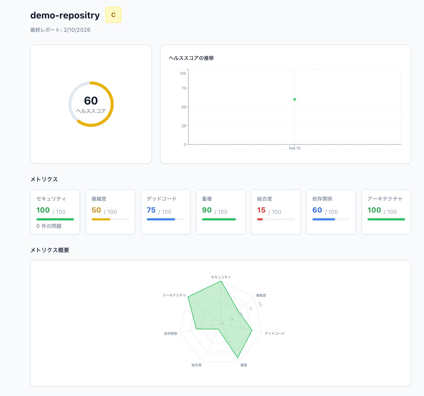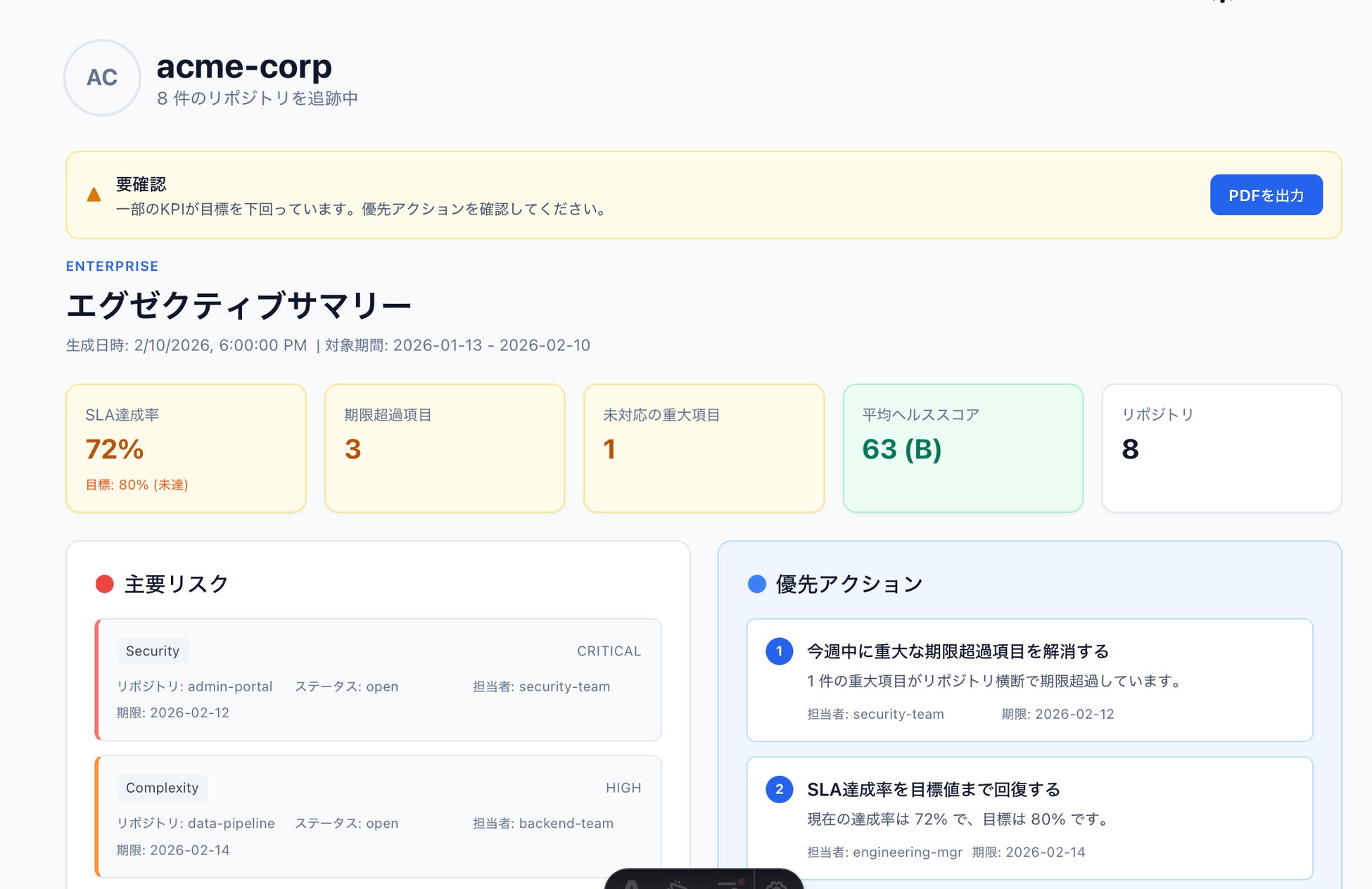 リポジトリごとのHealth Score、リスクの重要度別内訳、週次の変化量を一覧で把握できます。技術的な知識がなくても、「改善しているのか、悪化しているのか」が一目で分かります。PDFエクスポートにより、社内報告にもそのまま活用可能です。