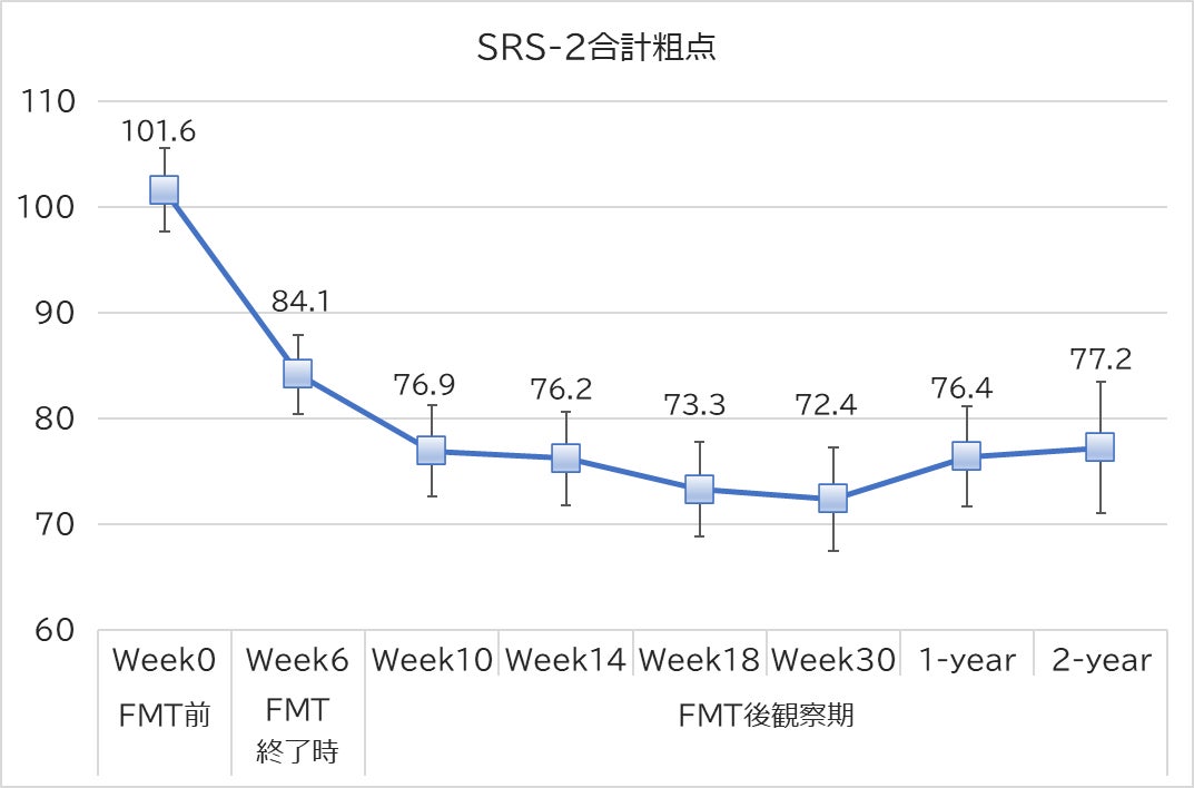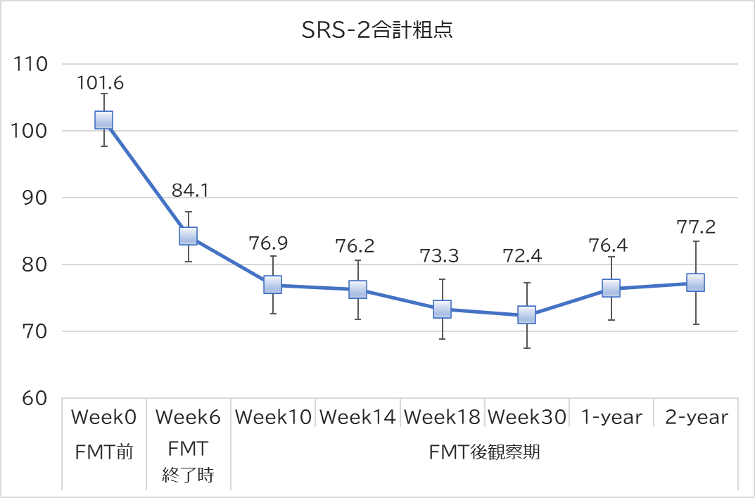 NanoGAS®-FMT法は、下図のとおり、ASD児の症状を有意に大きく軽減することが明らかになりました。即ち、FMT施行前の研究対象者30名のSRS-2による平均重症度(SRS-2合計粗点)が101.6に対して、30週後には、その値は72.4にまで減少しました。ASD重症度の低減率は約30%であり、この効果が2年後まで維持されることが明らかになりました。