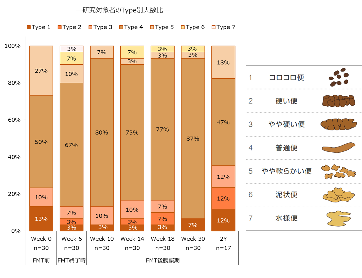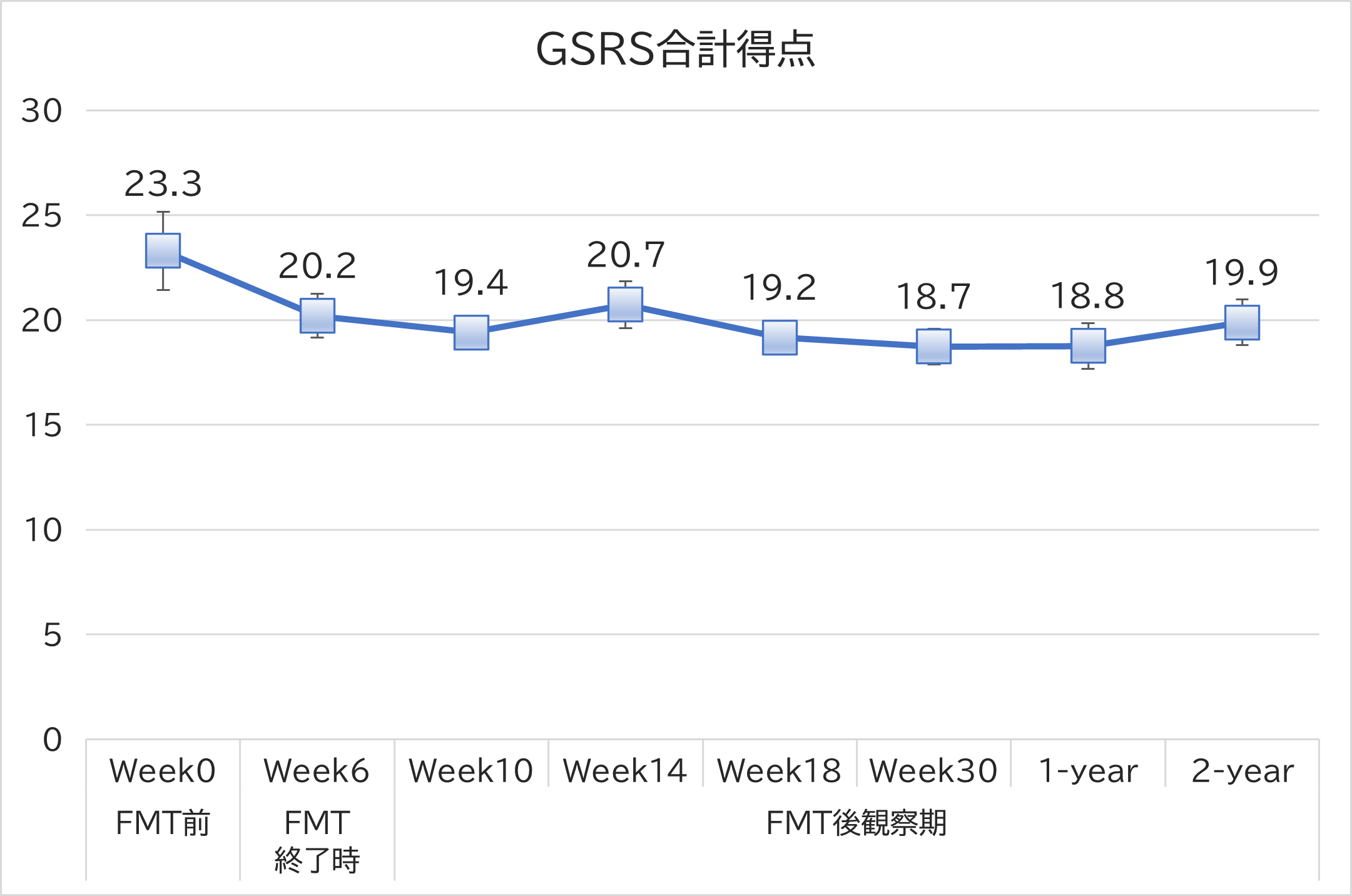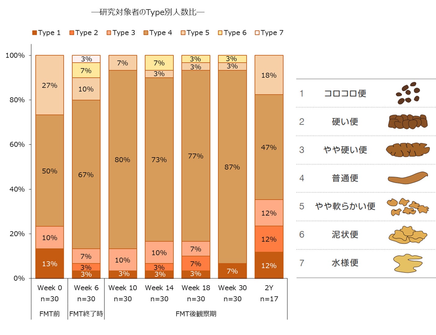 FMT施行前においては、研究対象者30名のうち、28名が重症域、1名が中等度域、および1名が正常域でした。FMT施行後30週の結果が2年後においても持続することが明らかになりました。