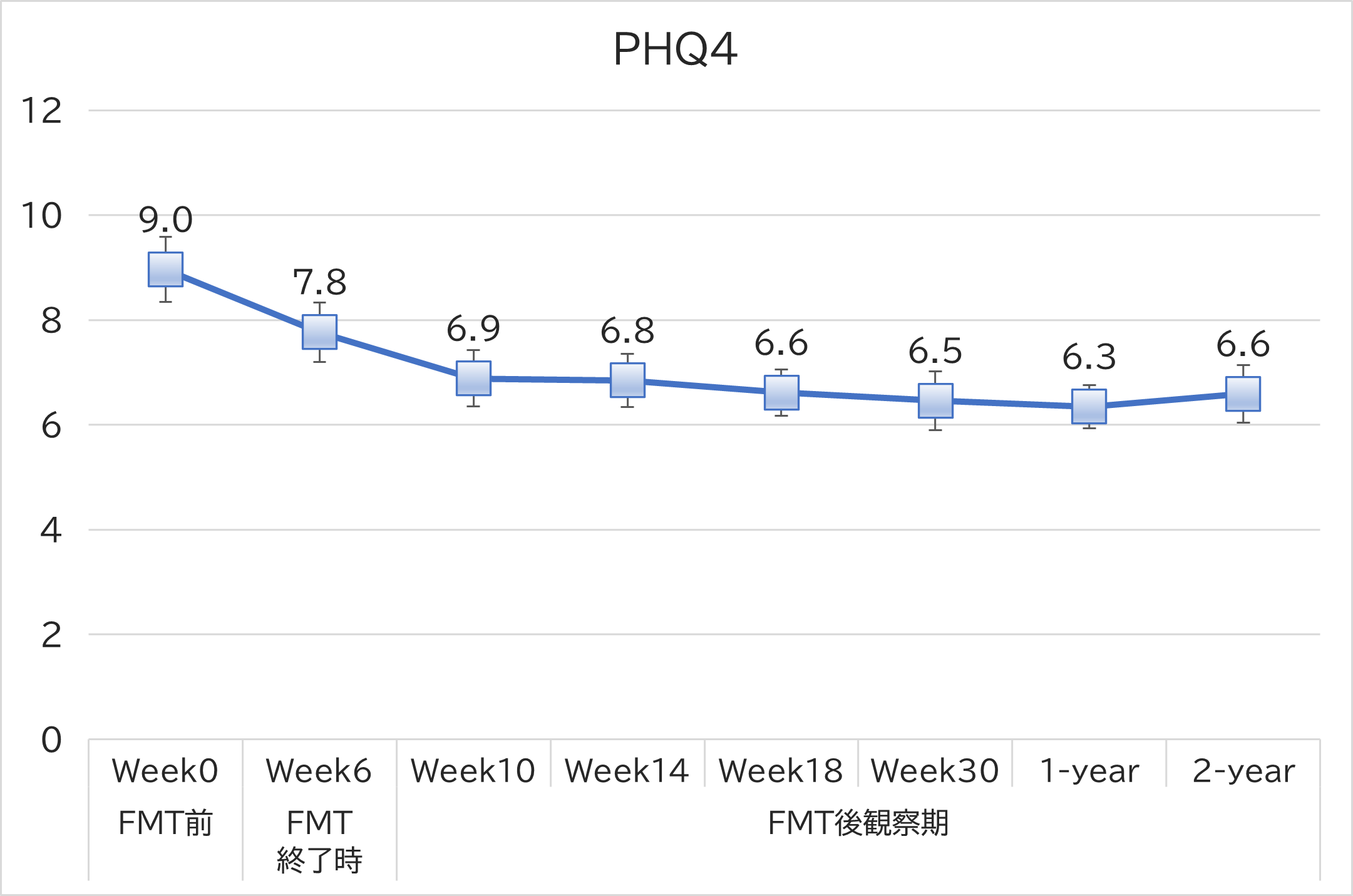 下図に、NanoGAS®-FMT法のPHQ-4による鬱(うつ)症状・不安症状に対する効果を示しました。