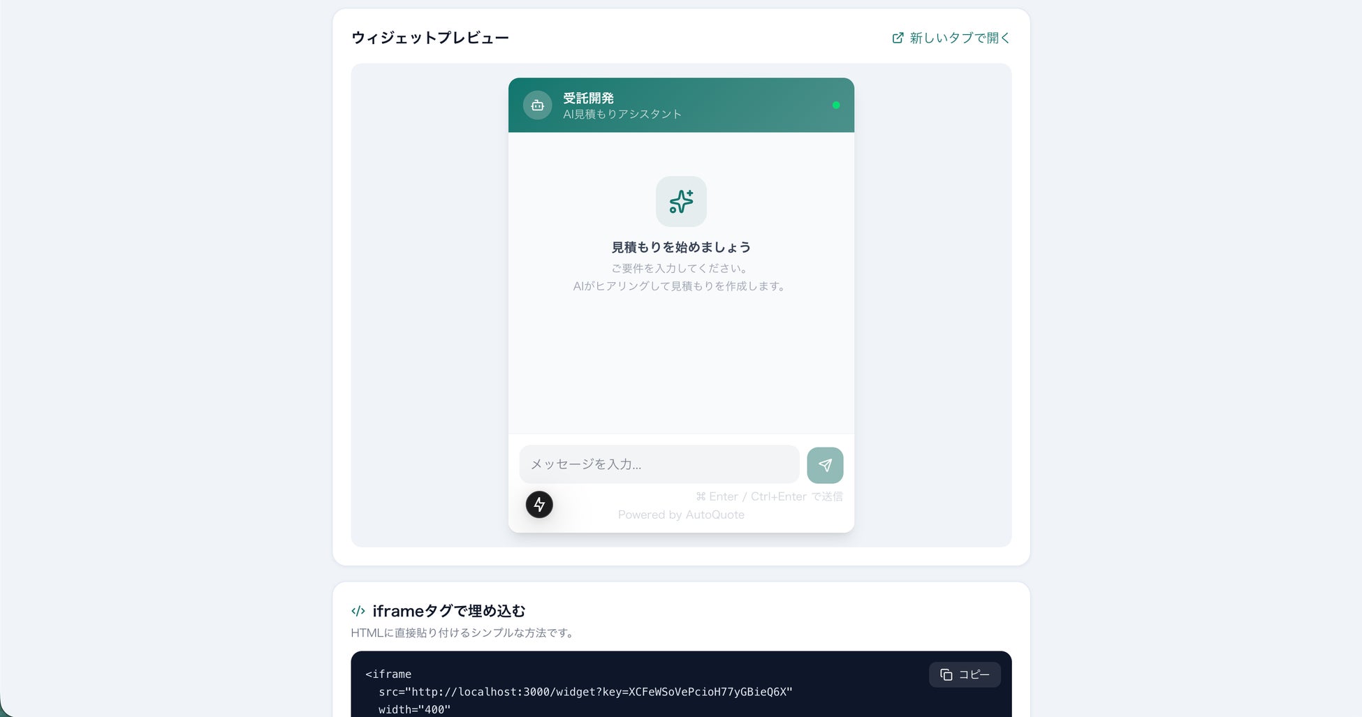 導入はとにかく簡単。発行されるscriptタグをコピー&ペーストするだけで、あなたのWebサイトにポップアップ型の見積もりチャットが表示されます。