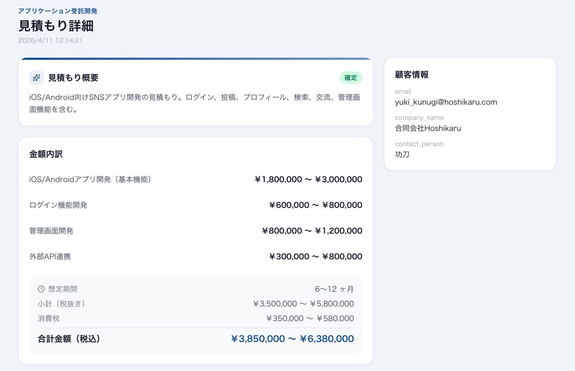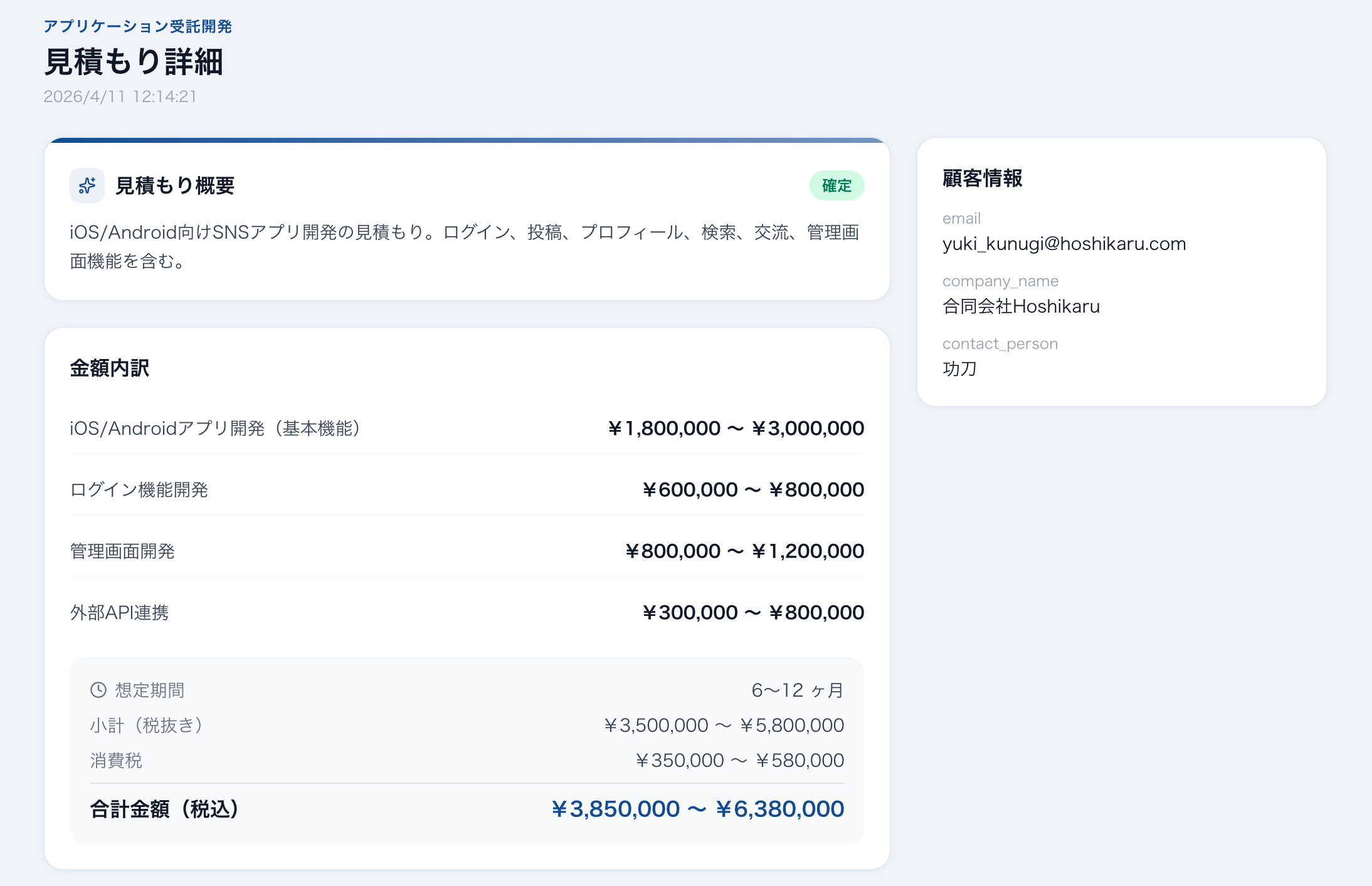 AIが生成した見積もりは自動で保存・管理されます。見積もり詳細画面では以下の情報をひと目で確認可能です。