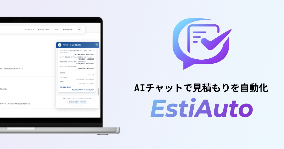 EstiAutoは、Webサイトにチャットウィジェットを埋め込むだけで、対話型AIが訪問者の要望をヒアリングし、金額内訳・合計金額・想定期間まで含む構造化された見積もりを自動で生成するクラウドサービスです。Freeプラン(無料)から利用開始でき、受託開発・Webデザイン・コンサルティング・リフォーム・翻訳など、見積もりが必要なあらゆるサービス業でご活用いただけます。