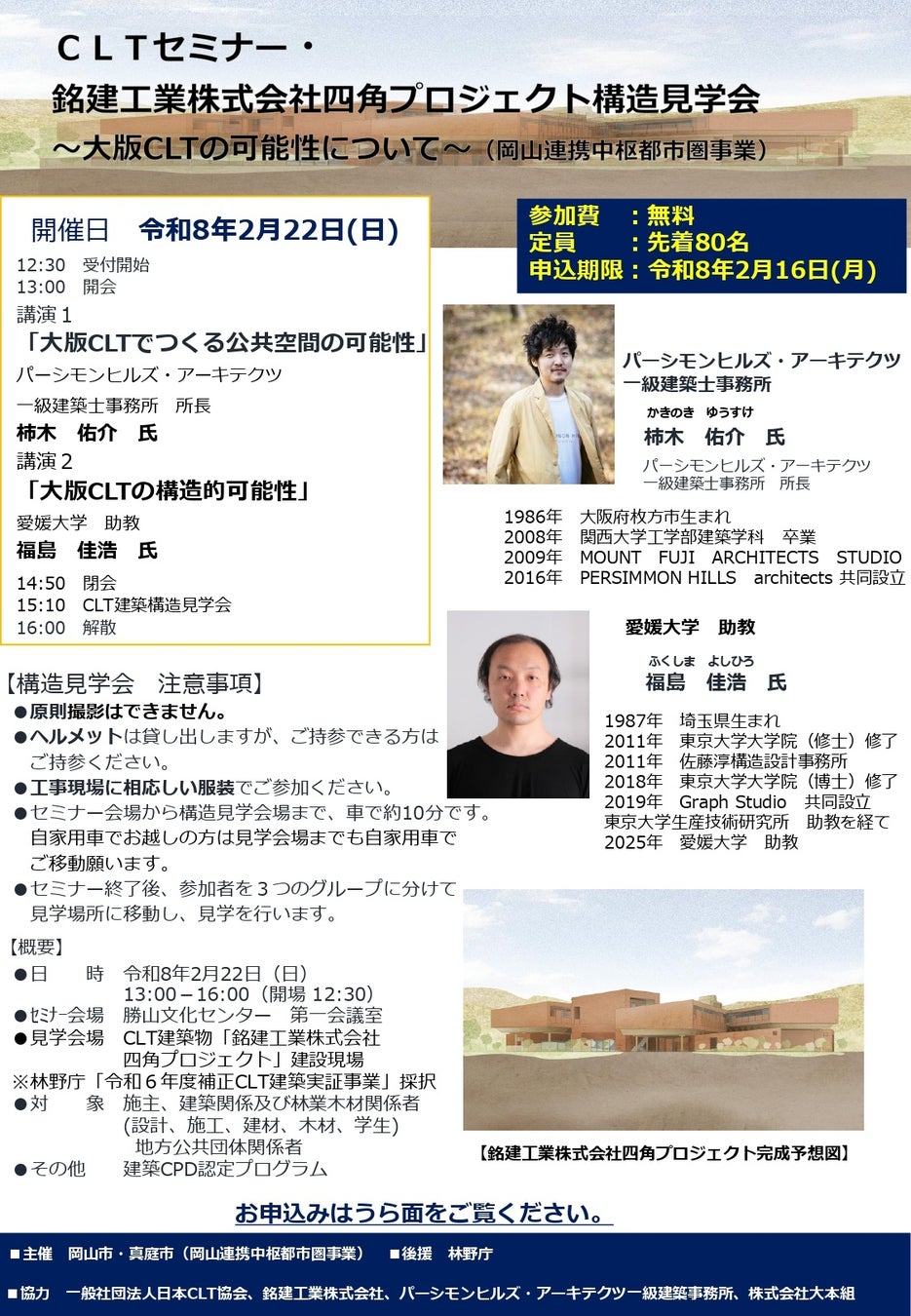 2026年2月22日(日)に真庭市および岡山市(岡山県連携中枢都市圏事業)が主催する「CLTセミナー」において、建設中の社宅を公開し、大版CLTによる新しい建築価値とその構造的特徴を紹介します(参加無料/定員80名/申込締切2月16日(月))。