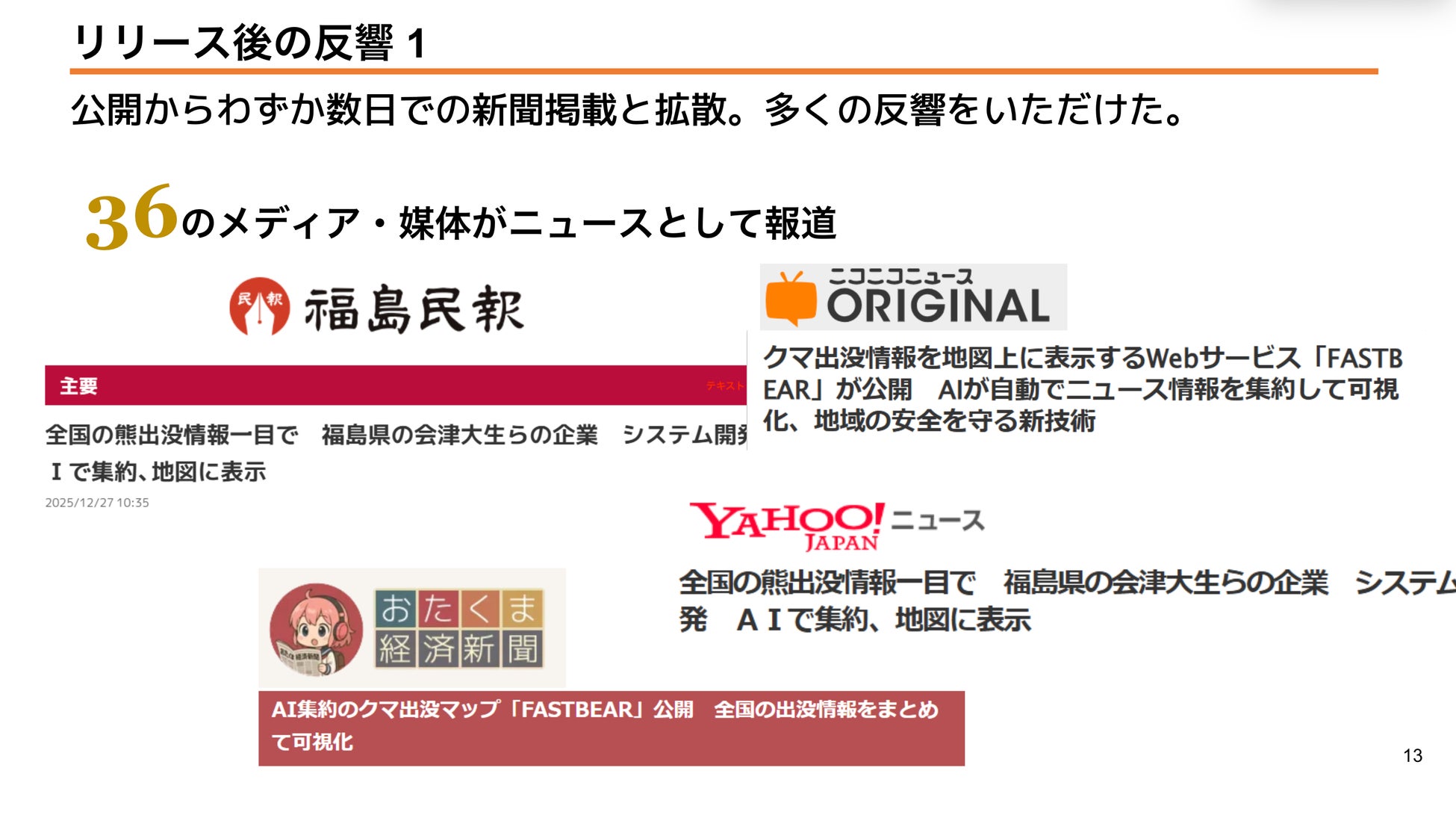 FASTBEARは2025年12月26日の公開以降、わずか数日で全国紙・地方紙・Webメディアを含む36の媒体でニュースとして取り上げられ、クマ出没対策における新しい情報基盤として注目を集めています。