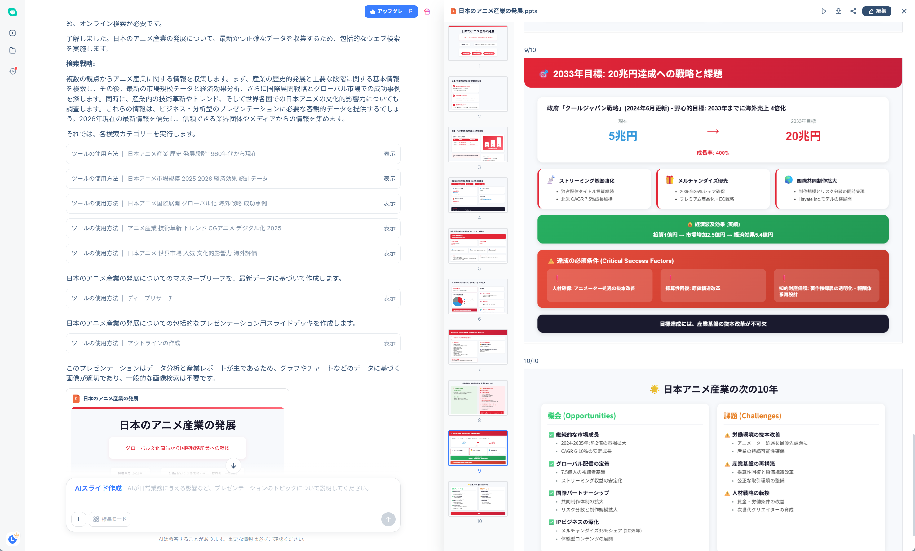 ステップ4. 最後に、AIがあなたの要望に基づいて関連情報をWeb上から検索し、参考元をすべて一覧化したうえで、完成したPPTを自動生成します。