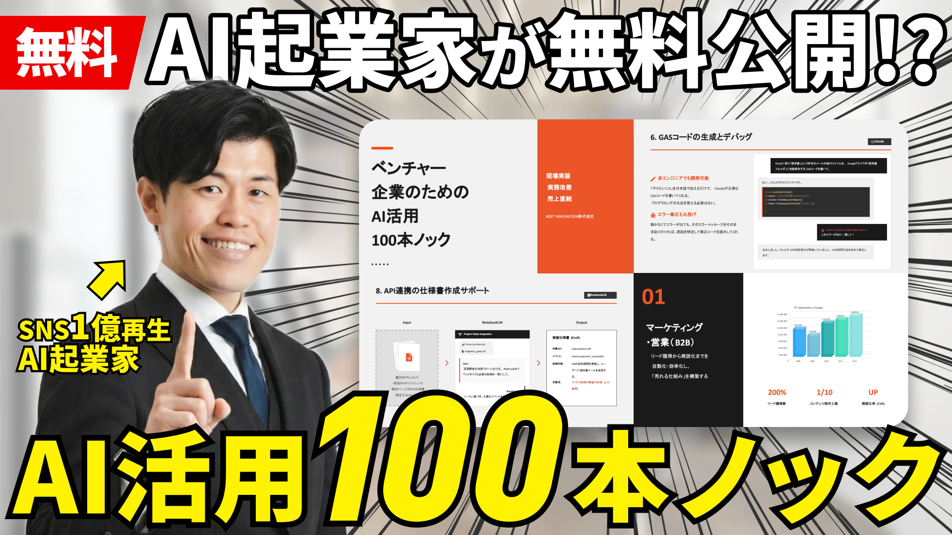 NEXT INNOVAITION株式会社(代表取締役:黒山 結音)は、ベンチャー企業のAI活用を“思いつき”で終わらせず、現場の成果に繋げるための実務資料 『ベンチャー企業のためのAI活用100本ノック』 を無料公開しました。