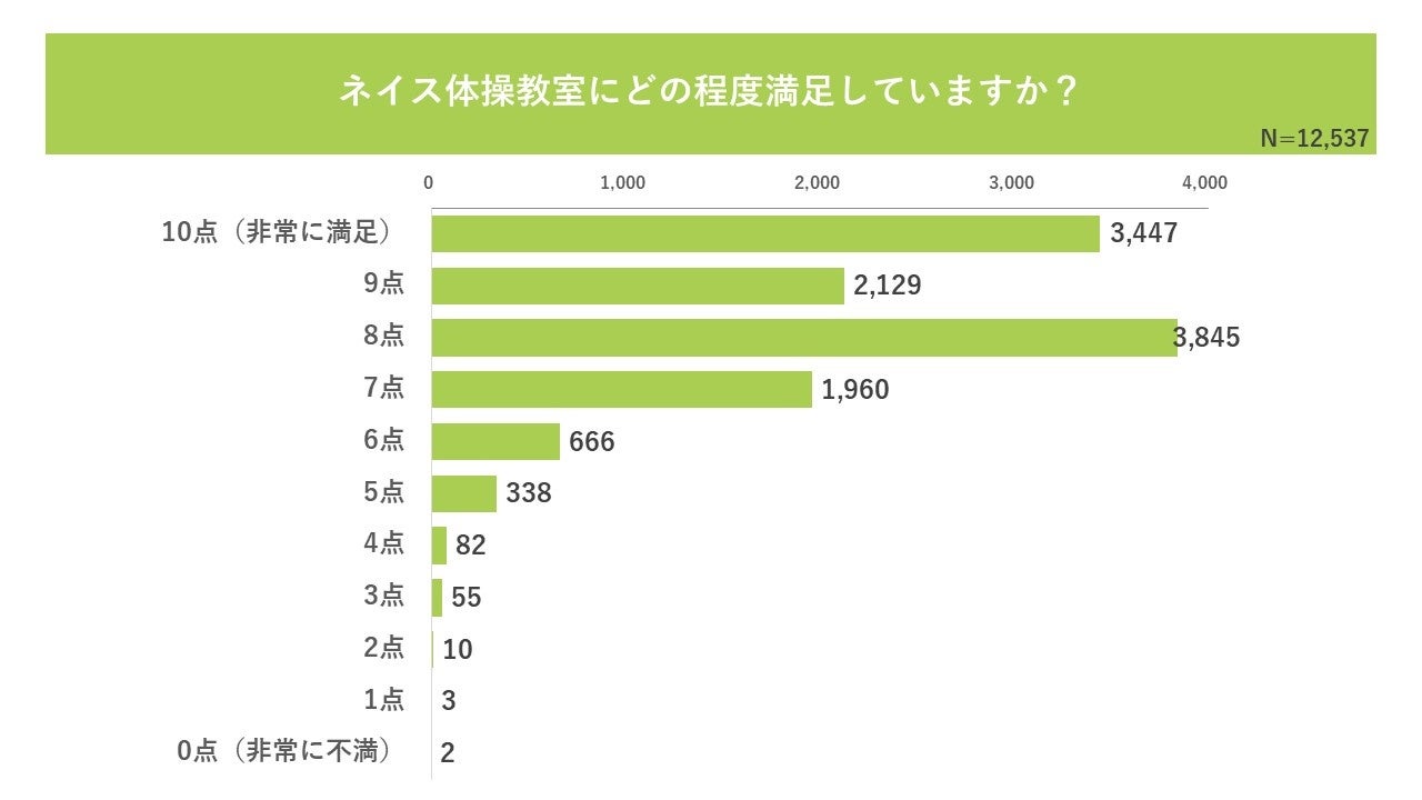 ネイス体操教室の満足度について尋ねたところ、10点満点中、平均8.3点となり、10点満点中9点以上をつけた保護者が44.5%にのぼるほか、「ここなら安心して預けられる」との声が挙がるなど、高い満足度を獲得しています。また、最も多かったのは10点(3,447件)、次いで8点(3,845件)、9点(2,129件)となっており、7点以上の高評価が全体の90.8%を占める結果となりました。