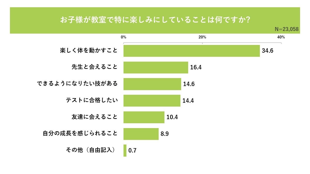 お子様が教室で特に楽しみにしていることは、「楽しく体を動かすこと」(34.6%)が最多となり、次いで「先生と会えること」(16.4%)、「できるようになりたい技がある」(14.6%)、「テストに合格したい」(14.4%)、「友達に会えること」(10.4%)が続いており、 体操教室が技術習得を超えて、人間関係を育む場として機能していることが伺える結果となりました。