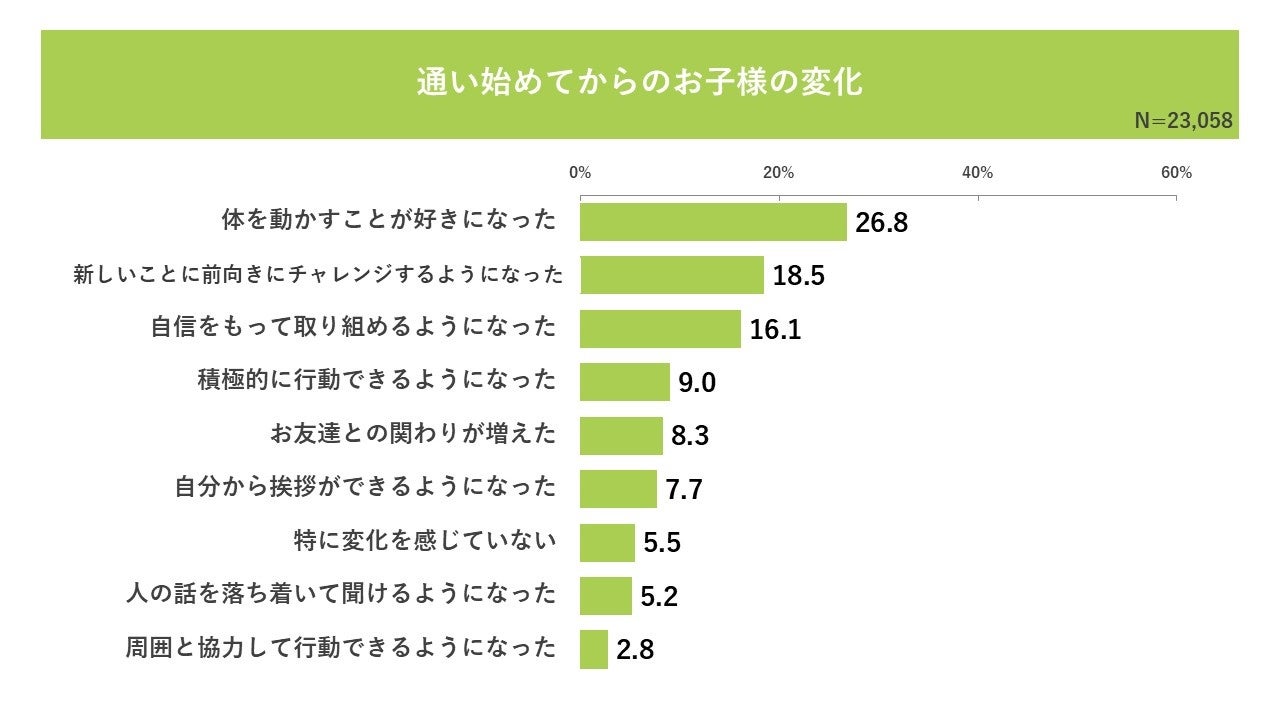 通い始めてから「体を動かすことが好きになった」子どもが26.8%、「新しいことに前向きにチャレンジするようになった」が18.5%、「自信をもって取り組めるようになった」が16.1%と、運動能力だけでなく自己肯定感・社会性の向上を実感する保護者が多数いることが明らかになりました。