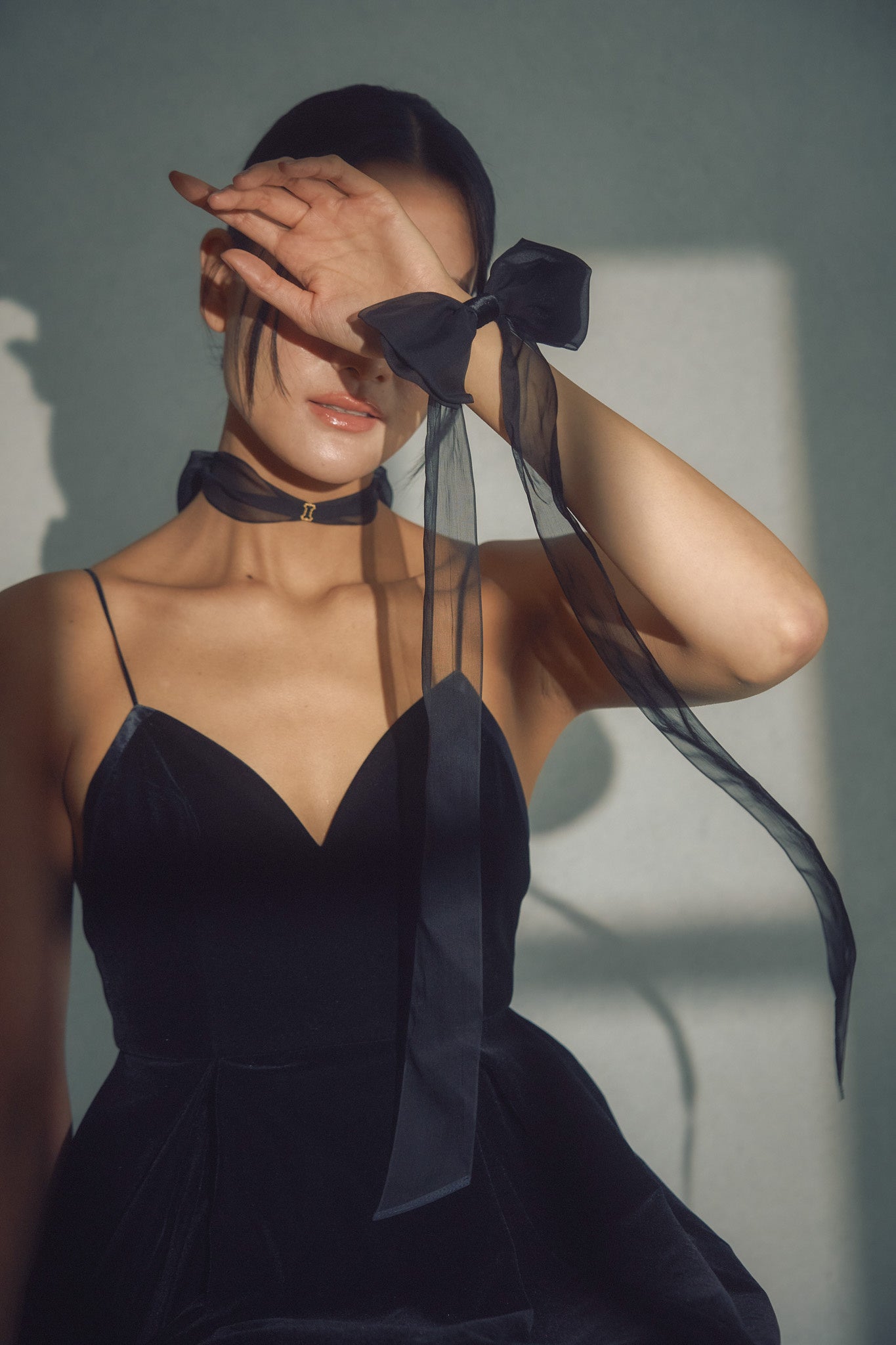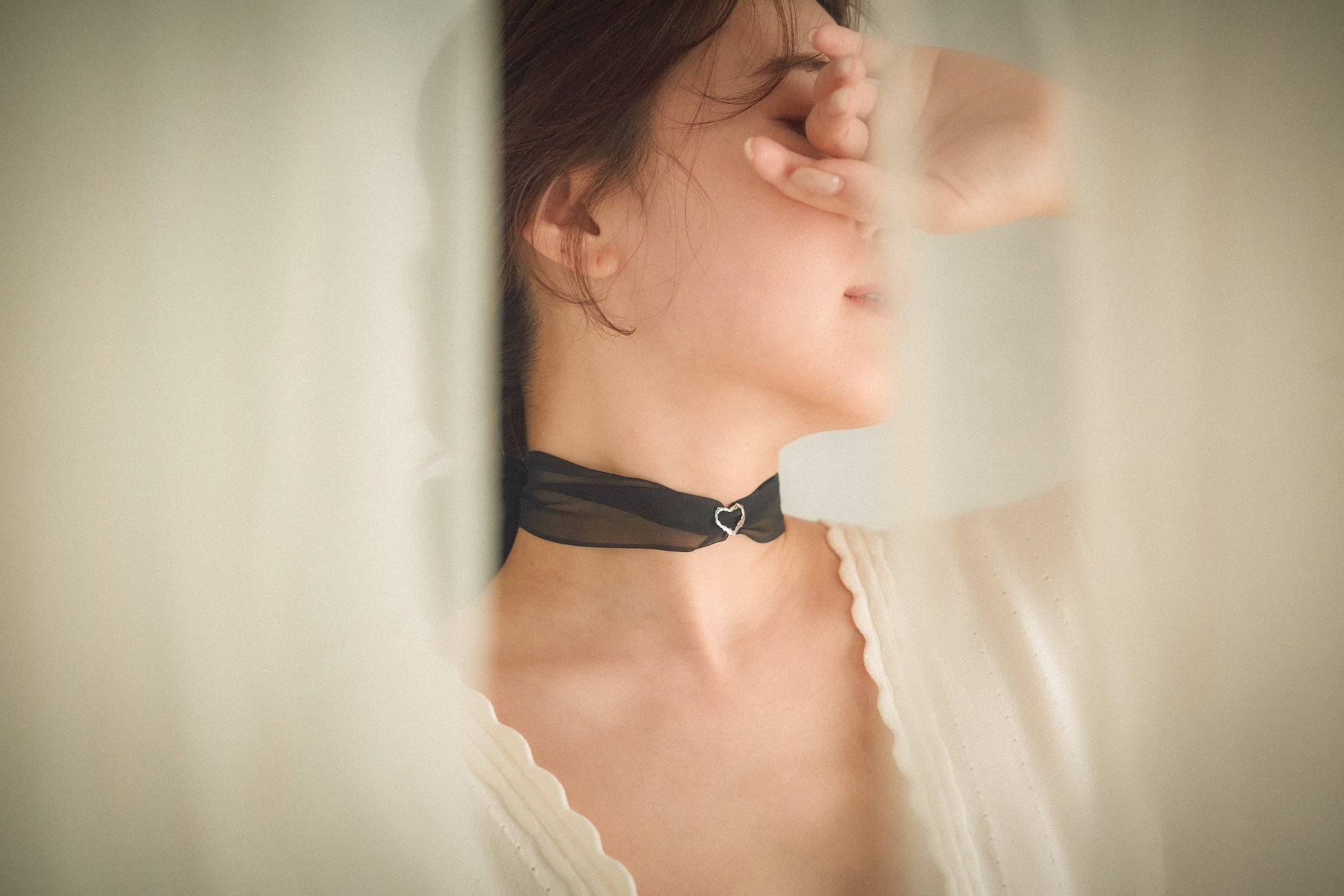 チョーカーの後ろ姿に結ばれたリボンが、ふわりと揺れる。飛び立った蝶が、その場所に残していく——可憐で静かな余韻のように。