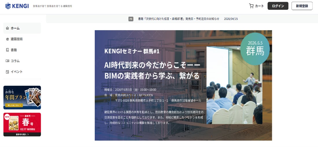 2026年3月にリリースした「KENGI」は、専門雑誌・書籍のECサイトおよびKENGIコラム機能を中心に、建築技術者への情報提供基盤として運営してまいりました。今回新たにイベント機能を追加することで、建築技術に関するセミナー・イベントの告知から参加申込までをプラットフォーム上で一元的に行えるようになります。