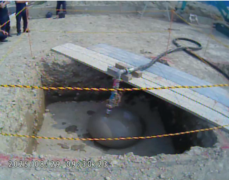 道路陥没対策用球体とは、道路に開けた小さな孔から地下空洞へ挿入し、内部に流動化処理土やコンクリートを注入して膨張させることで、空洞周辺の支持性回復と荷重伝達の確保を図る球体型部材です。