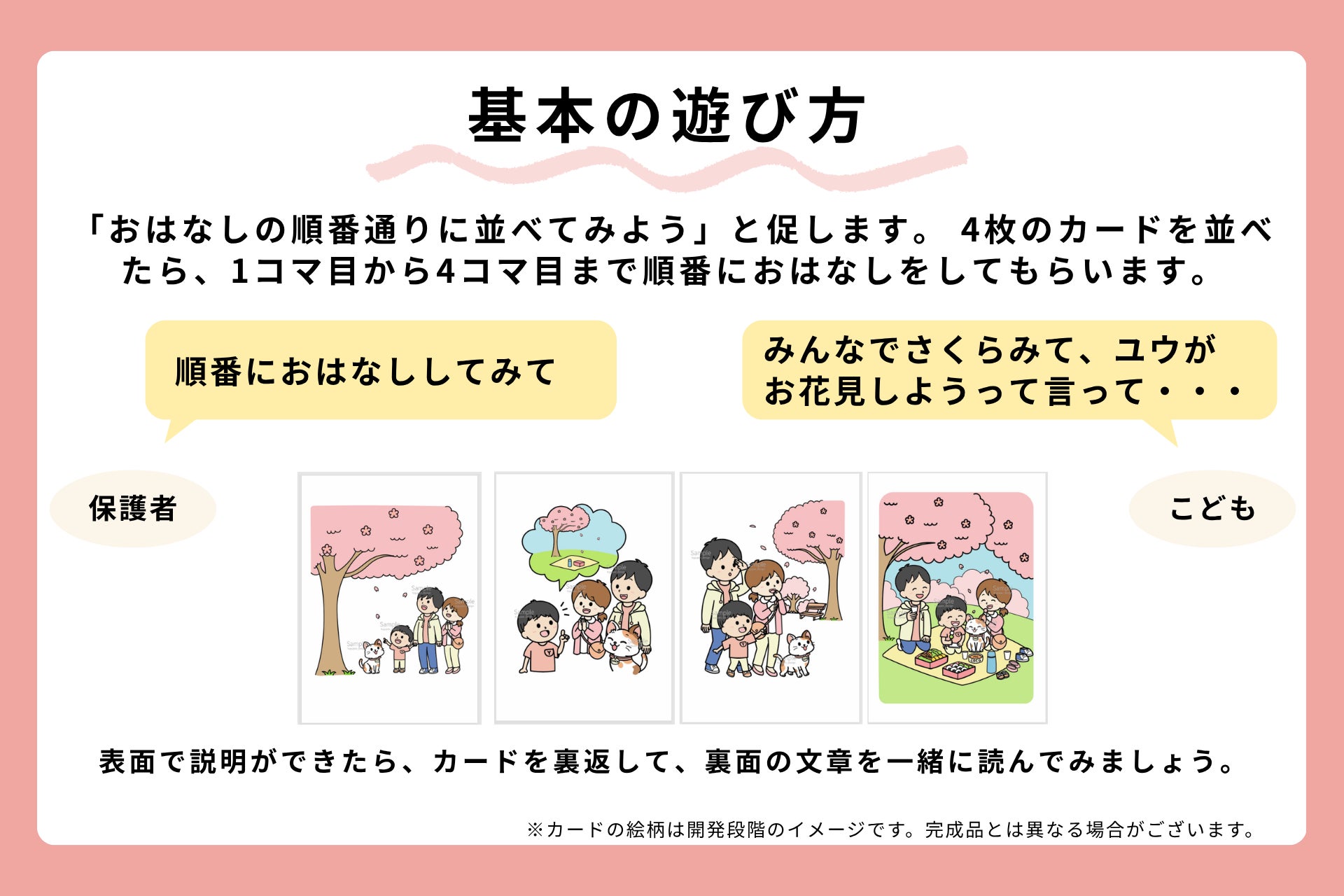 今回開発する「おはなしづくりカード」は現役の言語聴覚士が監修。日常生活に即した4コマ構成のカードで、語彙が少ないお子さんでも無理なく取り組めます。