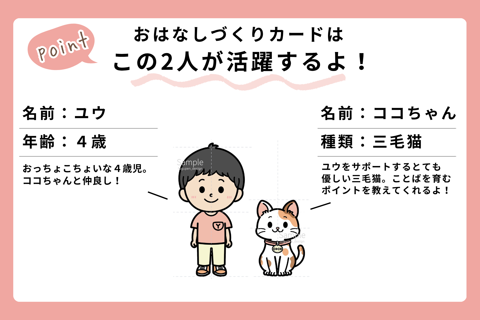 Cocoのマスコットキャラクターであるユウとココちゃんが絵カードに登場。2人のかわいらしいやりとりがこどもの興味を引き、自然とおはなしづくりに取り組めます。
