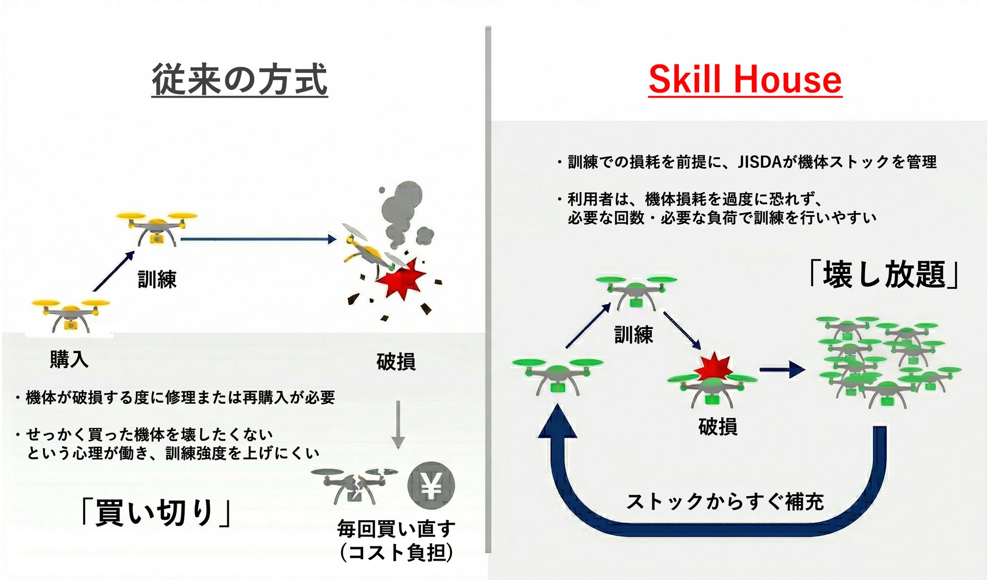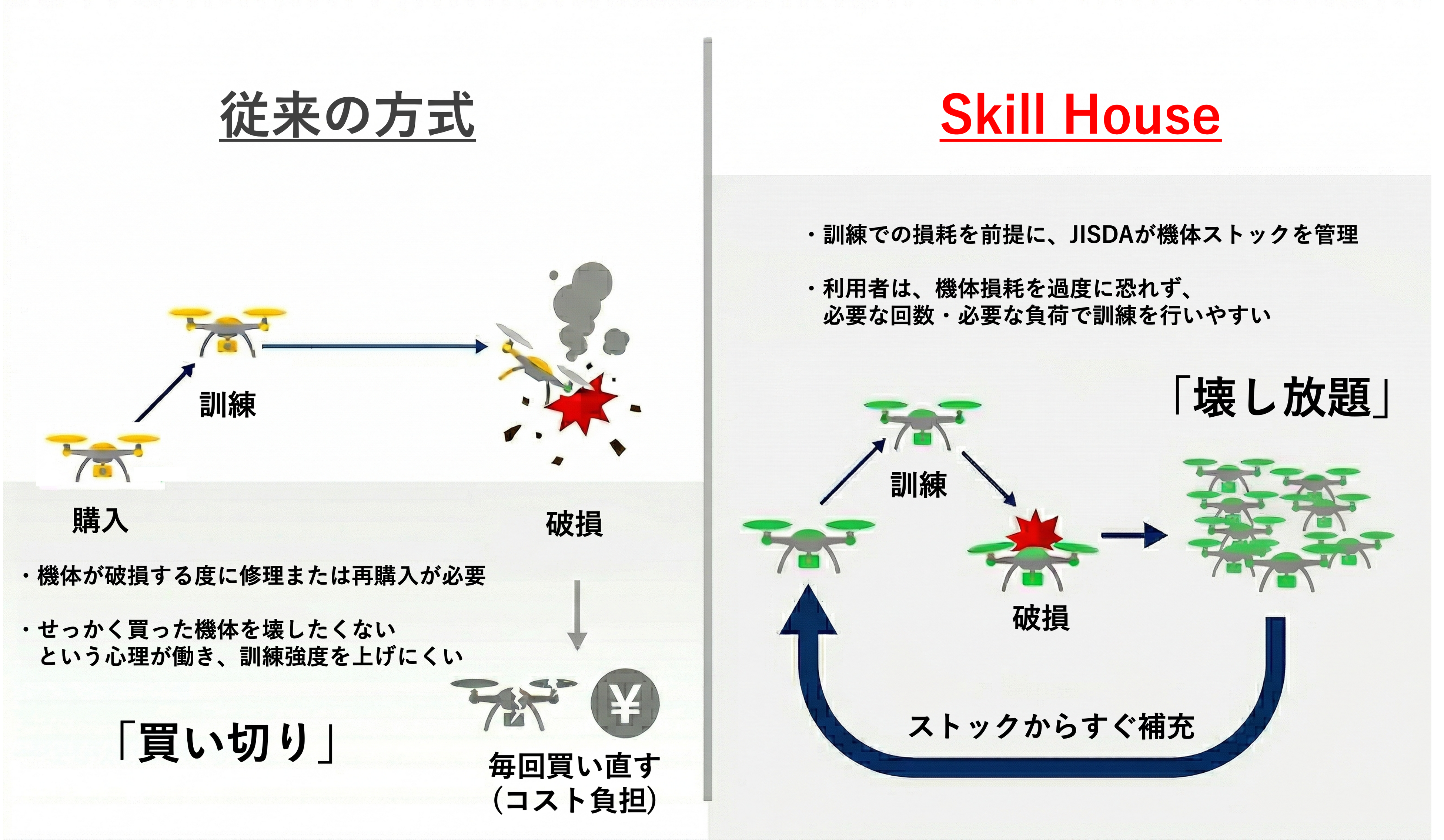 「Skill House」の大きな特長は、訓練用機体をその都度購入するのではなく、一定条件のもとで包括的に利用できる(=「壊し放題」である)点にあります。JISDAが自社製品・他社製品を含む機体ストックを管理し、訓練の現場が継続的に機体を使える環境を整えます。
