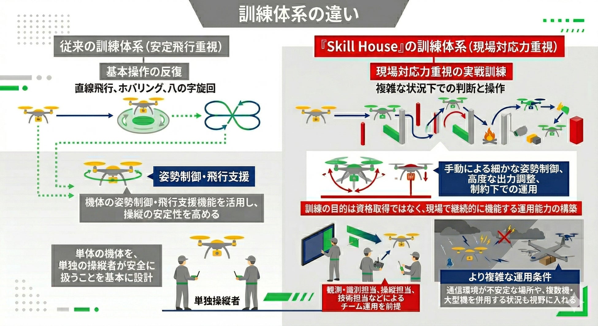 「Skill House」では、一般的な民生訓練の枠にとどまらず、安全保障・危機管理分野で求められる現場対応力を意識した訓練を提供します。操縦技能だけでなく、通信環境の制約、複数機の運用、チームでの連携など、より実際の現場に近い条件で能力づくりを支援します。