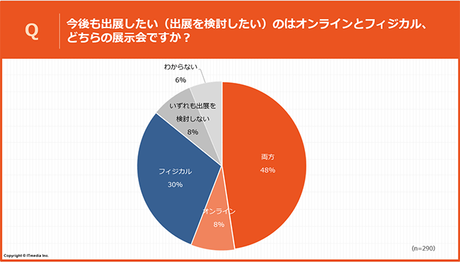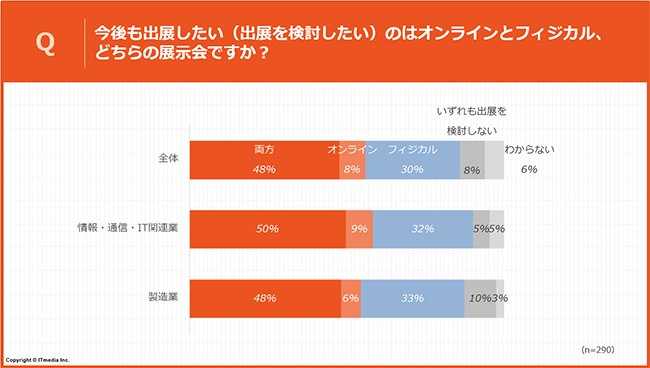 今後も出展したい(出展を検討したい)のはオンラインとフィジカルどちらの展示会かを尋ねたところ、「両方」(48%)が最も多く、「オンライン」(8%)とあわせると過半数が引き続きオンライン展示会を検討するとの回答でした。業種別にみても大きな違いはなく、コロナ禍で急増したオンライン展示会からフィジカルへの回帰傾向はあるものの、依然としてオンライン展示会のニーズは高いことが分かりました。
