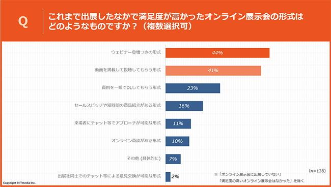 オンライン展示会に出展経験者に満足度が高かった形式を聞いたところ、「ウェビナー登壇つきの形式」(44%)「動画を掲載して視聴してもらう形式」(41%)が4割以上となり、その他の形式と大きな差がつく結果となりました。内容が複雑になりがちなBtoBの商材に関しては、ウェビナーや動画などのリッチなコンテンツを利用して参加者の理解を得ると成果が出やすいようです。