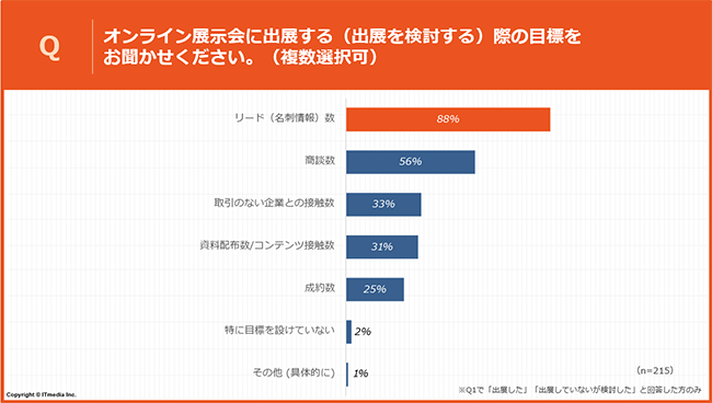 また、出展時の目標としては「リード(名刺情報)数」(88%)が約9割を占め、オンライン展示会は多くのリードを一度に集められる場として期待されていることがわかりました。特に、情報・通信・IT関連業では、より強くこの傾向が見て取れました。(94%)