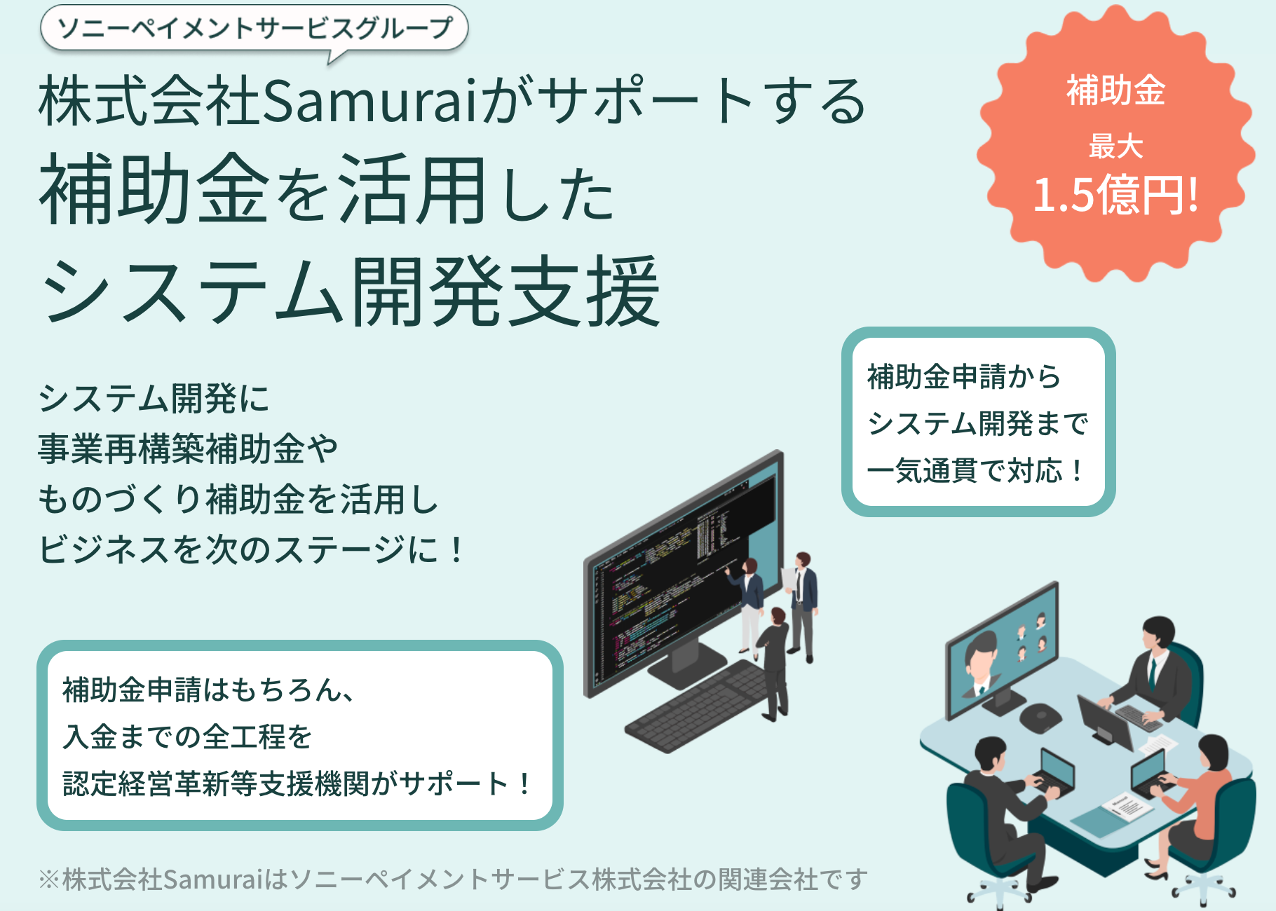 キャッシュレスサービスおよびオムニチャネルサービスを開発販売する株式会社Samurai(本社:東京都渋谷区、代表取締役社長 須永啓太 以下、当社)は、補助金を活用したシステム構築支援サービスを発表いたしました。補助金申請からシステム開発までを一気通貫でサポートすることで、クライアント企業の事業成長をサポートします。