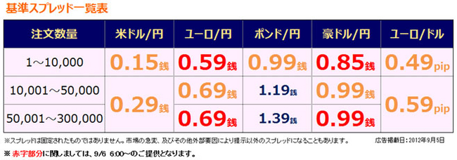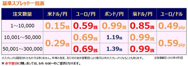 SBI FXトレードが提供する外国為替証拠金取引「SBI FXTRADE」は、2012年9月6日(木)午前6時より、ユーロ/円0.59銭(1万通貨注文まで)、豪ドル/円0.85銭(1万通貨注文まで)における基準スプレッド縮小を実施いたしますのでお知らせいたします。