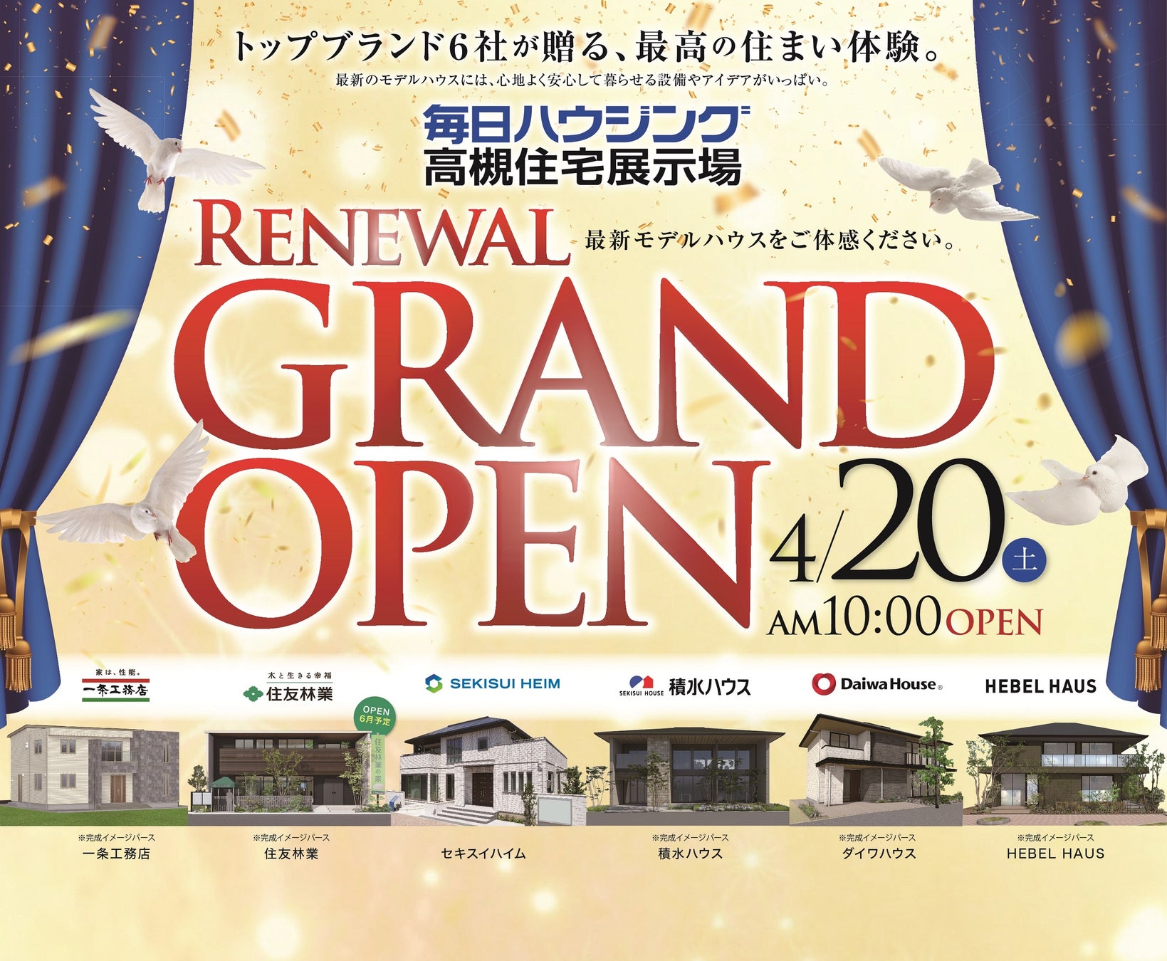国道171号線沿いの「毎日ハウジング高槻住宅展示場」が2024年4月20日(土)に新しく建て替えられた最新モデルハウスとともにリニューアル グランドオープン。一条工務店、住友林業、セキスイハイム、積水ハウス、ダイワハウス、HEBEL HAUSの国内トップブランド6社の最先端モデルハウス6棟を展示。大空間リビング・ダイニング・キッチンなど『プライム(上質)な空間』と環境への配慮はもちろん、『災害に強い住まい』を体感できるこの展示場では、狭小地でのゆとりある住空間の提案やマンションから戸建てへの住み替え相談、二世帯住宅・賃貸併用住宅・店舗併用住宅・平屋など、さまざまな建築プランの相談も可能です。新モデルハウスが続々オープンする「毎日ハウジング高槻住宅展示場」が未来の住まいに関するすべてのニーズにお応えします。