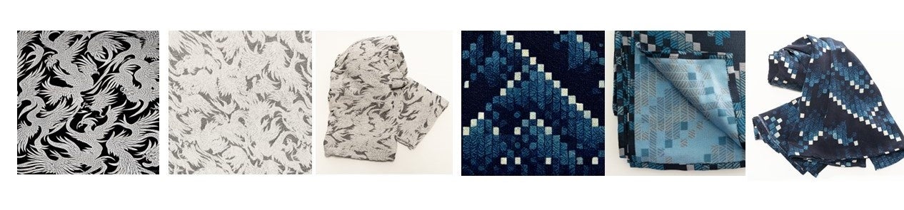 伝統的なモチーフ「鱗紋」「亀甲紋」「鳳凰」をAIに再解釈させ、テキスタイルに仕上げた「伝統」と「革新」のコラボレーション作品。林氏の手がけるAI作品が融合したパターンを、京都の丹後ちりめん老舗企業「kuska fabric」と「宮眞」が織り上げることで、これまでにない、美しくあたらしいテキスタイルが生み出されました。丹後ちりめんの魅力も知って頂きたく、ストールに仕上げました。