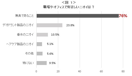 さらに、ノカレ クローズシャワーは無香料です。前述の弊社実施調査では、オフィスや職場でのニオイとしてもっとも好ましいのは、「無臭であること」という結果が得られました。(図1参照)