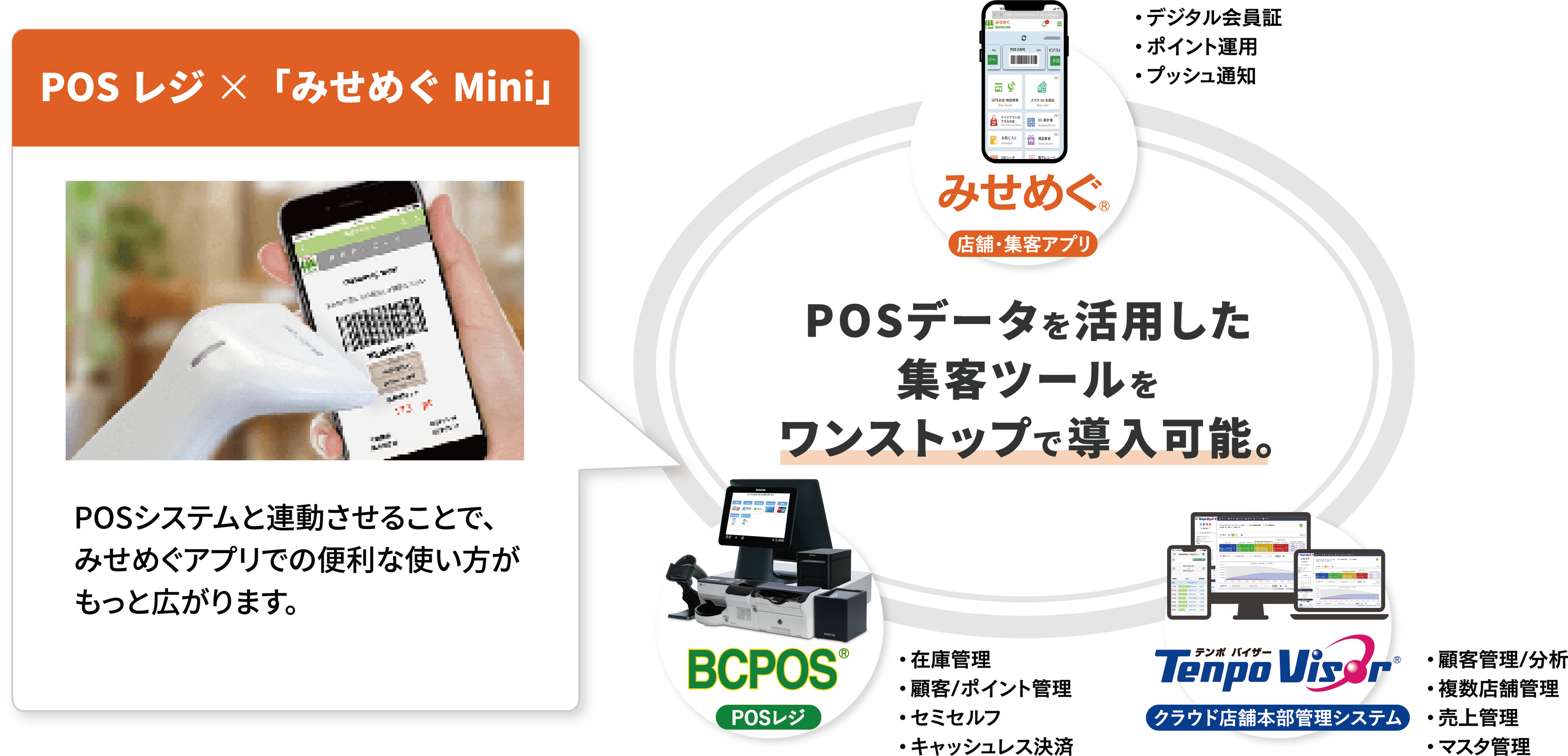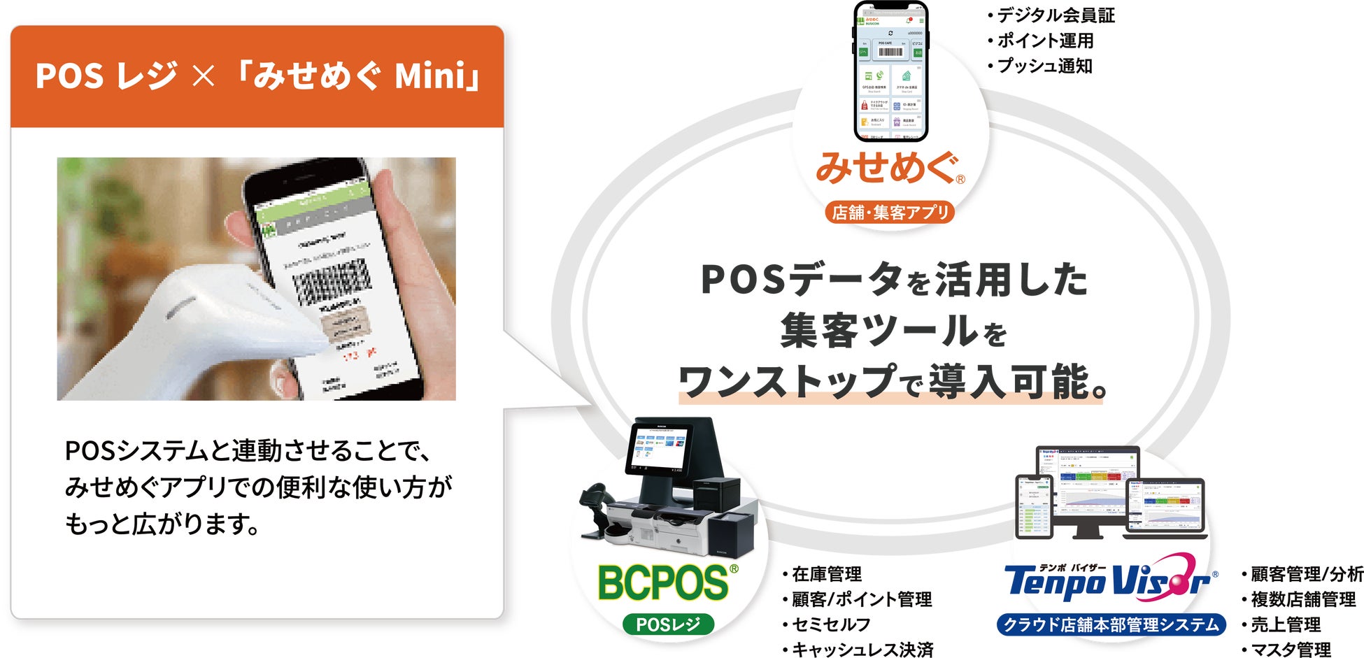 お店のLINE公式アカウントでお友達登録してもらうだけで、リッチメニュー「みせめぐMini」から簡単に会員登録とデジタル会員証の発行が同時にできて一石二鳥です。これにより、会員管理や集客が容易になります。LINEアプリ上でポイント情報や購入履歴を表示、商品やメニュー、チラシなどの情報提供、多店舗の場合は、店舗リストを距離順に表示し、各店舗を紹介することもできます。ビジコムのPOSレジ「BCPOS」と連動するとポイント管理や購入履歴の表示も可能、さらにクラウドシステム「TenpoVisor」を利用すると購買分析も行えます。